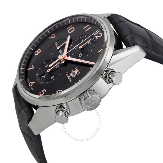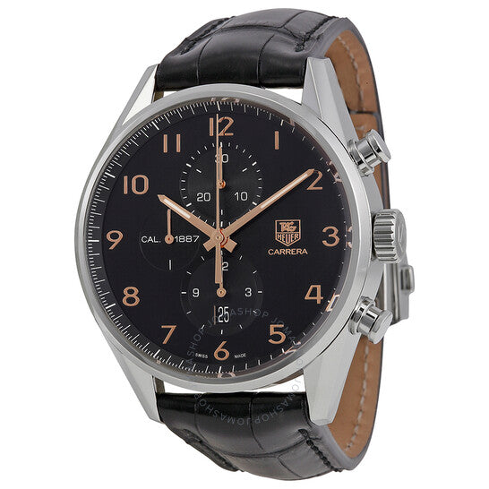 علبة من الفولاذ المقاوم للصدأ مع سوار أسود من جلد التمساح. إطار ثابت من الفولاذ المقاوم للصدأ. ميناء أسود بعقارب بلون الذهب الوردي وعلامات ساعات بأرقام عربية. علامات دقائق حول الحافة الخارجية. نوع الميناء: تناظري. عقارب وعلامات مضيئة. يظهر عرض التاريخ فوق موضع الساعة السادسة. كرونوغراف - ثلاثة أقراص فرعية تعرض: ٦٠ ثانية، ٣٠ دقيقة، و١٢ ساعة. حركة أوتوماتيكية. زجاج ياقوت مقاوم للخدش. تاج قابل للسحب/الدفع. ظهر هيكل عظمي. قطر العلبة: ٤٣ مم. سمكها: ١٦.٢ مم. شكلها دائري. عرض السوار: ٢٢ مم. مشبك قابل للطي مع مفتاح أمان. مقاومة للماء حتى عمق ١٠٠ متر / ٣٣٠ قدمًا. الوظائف: كرونوغراف، تاريخ، ساعة، دقيقة، ثانية. طراز ساعة رسمية. علامة الساعة: صناعة سويسرية. ساعة تاج هوير كاريرا كاليبر 1887 كرونوغراف أوتوماتيكية بمينا أسود للرجال CAR2014.FC6235.