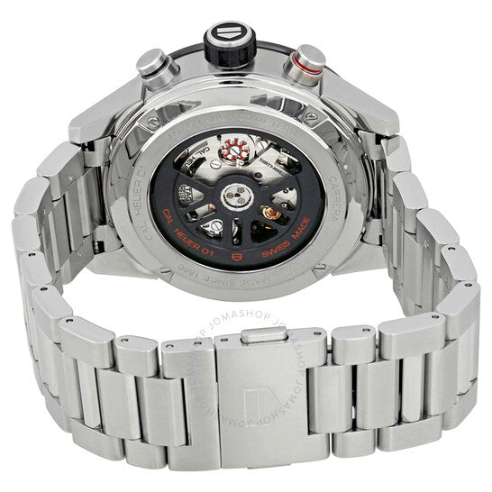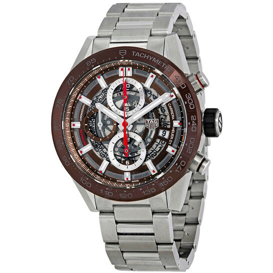 علبة من الفولاذ المقاوم للصدأ مع سوار من الفولاذ المقاوم للصدأ. إطار ثابت من السيراميك البني يعرض علامات مقياس سرعة الدوران. ميناء بني هيكلي مع عقارب وعلامات ساعات فضية مضيئة. علامات دقائق حول الحافة الخارجية. نوع الميناء: تناظري. عقارب وعلامات مضيئة. عرض التاريخ بين موضعي الساعة 4 و5. كرونوغراف - ثلاثة أقراص فرعية تعرض: 60 ثانية، 30 دقيقة، و12 ساعة. حركة أوتوماتيكية من طراز TAG Heuer عيار 01، مبنية على طراز TAG Heuer عيار 1887، تحتوي على 39 جوهرة، تنبض بمعدل 28800 ذبذبة في الساعة، ولديها احتياطي طاقة لمدة 50 ساعة تقريبًا. زجاج ياقوت مقاوم للخدش. تاج قابل للسحب/الدفع. غطاء خلفي شفاف. شكل دائري. حجم العلبة: 43 مم. سمك العلبة: 16.5 مم. عرض السوار: 22 مم. مشبك قابل للطي بزر ضغط. مقاومة للماء حتى عمق 100 متر / 330 قدمًا. الوظائف: كرونوغراف، مقياس سرعة الدوران، التاريخ، الساعات، الدقائق، الثواني. سلسلة كاريرا. تصميم فاخر. علامة الساعة: صناعة سويسرية. ساعة تاغ هوير كاريرا كرونوغراف أوتوماتيكية للرجال CAR201U.BA0766.