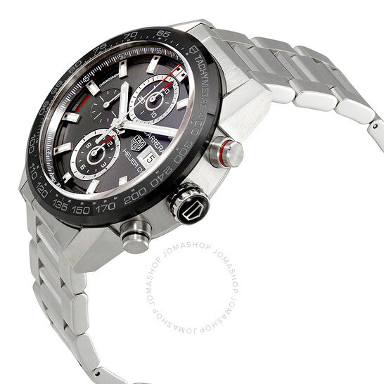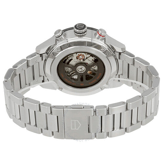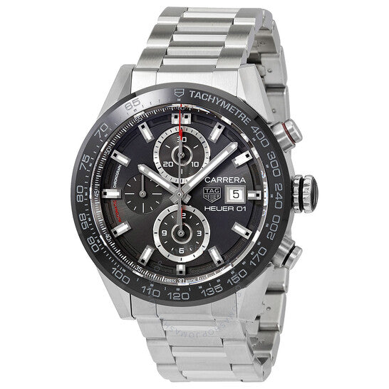 علبة من الفولاذ المقاوم للصدأ مع سوار من الفولاذ المقاوم للصدأ. إطار ثابت من السيراميك الأسود يعرض علامات التاكيمتر. ميناء من الأنثراسيت مع عقارب وعلامات ساعات فضية مضيئة. علامات دقائق بأرقام عربية (بفاصل 5 دقائق). علامات دقائق حول الحافة الخارجية. نوع الميناء: تناظري. عقارب وعلامات مضيئة. عرض التاريخ عند موضع الساعة 3. كرونوغراف - ثلاثة أقراص فرعية تعرض: 60 ثانية، 30 دقيقة، و12 ساعة. حركة أوتوماتيكية من طراز TAG Heuer عيار 01، مبنية على طراز TAG Heuer عيار 1887، تحتوي على 39 جوهرة، تنبض بمعدل 28800 ذبذبة في الساعة، ولديها احتياطي طاقة لمدة 50 ساعة تقريبًا. زجاج ياقوت مقاوم للخدش. تاج قابل للسحب/الدفع. غطاء خلفي شفاف. شكل دائري. حجم العلبة: 43 مم. سمك العلبة: 12 مم. عرض السوار: 22 مم. مشبك قابل للطي بزر ضغط للتحرير. مقاومة للماء حتى عمق ١٠٠ متر / ٣٣٠ قدمًا. الوظائف: كرونوغراف، تاريخ، ساعات، دقائق، ثوانٍ، مقياس سرعة الدوران. سلسلة كاريرا. تصميم فاخر. علامة الساعة: صناعة سويسرية. ساعة تاغ هوير كاريرا كرونوغراف أوتوماتيكية للرجال CAR201W.BA0714.