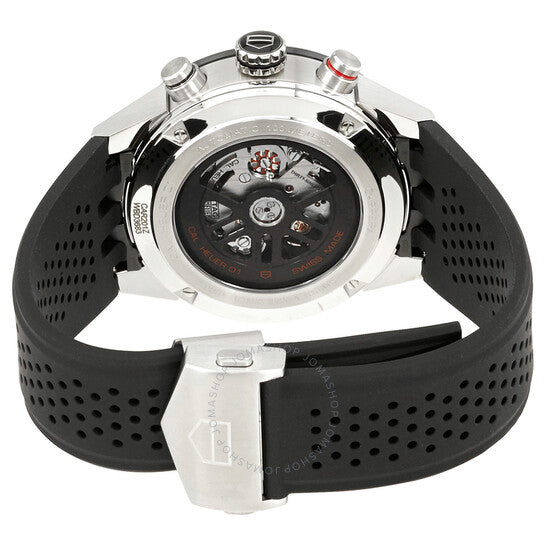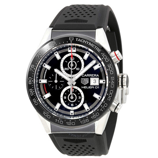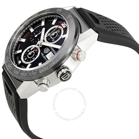 علبة من الفولاذ المقاوم للصدأ مع سوار مطاطي أسود. إطار ثابت من السيراميك الأسود يعرض علامات مقياس سرعة الدوران. ميناء أسود بعقارب وعلامات ساعات فضية مضيئة. علامات دقائق حول الحافة الخارجية. نوع الميناء: تناظري. عقارب وعلامات مضيئة. عرض التاريخ عند موضع الساعة 3. كرونوغراف - ثلاثة أقراص فرعية تعرض: 60 ثانية، 30 دقيقة، و12 ساعة. حركة أوتوماتيكية من طراز TAG Heuer Calibre 01، مبنية على طراز TAG Heuer Calibre 1887، تحتوي على 39 جوهرة، تنبض بمعدل 28800 ذبذبة في الساعة، ولديها احتياطي طاقة لمدة 50 ساعة تقريبًا. زجاج ياقوت مقاوم للخدش. تاج قابل للسحب/الدفع. غطاء خلفي شفاف. شكل دائري. حجم الهيكل: 43 مم. سمك الهيكل: 17 مم. عرض السوار: 24 مم. مشبك قابل للطي بزر ضغط للتحرير. مقاومة للماء حتى عمق 100 متر / 330 قدمًا. الوظائف: كرونوغراف، تاريخ، ساعات، دقائق، ثوانٍ، عداد سرعة الدوران. سلسلة كاريرا. تصميم فاخر. علامة الساعة: صناعة سويسرية. ساعة تاغ هوير كاريرا كرونوغراف أوتوماتيكية للرجال CAR201Z.FT6046.