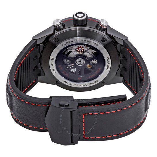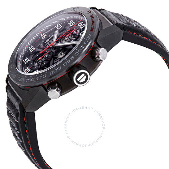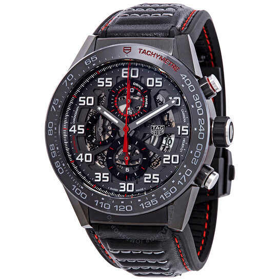 علبة من الفولاذ المقاوم للصدأ مطلية بتقنية PVD باللون الأسود، مع سوار من جلد العجل الأسود (مغطى بالجلد). إطار ثابت من السيراميك الأسود يعرض علامات قياس السرعة. ميناء هيكلي أسود بعقارب مضيئة مطلية بالروديوم وعلامات دقائق بأرقام عربية (بفاصل 5 دقائق). علامات دقائق حول الحافة الخارجية. نوع الميناء: تناظري. عقارب وعلامات مضيئة. عرض التاريخ بين موضعي الساعة 3 و4. كرونوغراف - ثلاثة أقراص فرعية تعرض: 60 ثانية، 30 دقيقة، و12 ساعة. حركة أوتوماتيكية من كاليبر هوير 01 مع احتياطي طاقة يصل إلى 50 ساعة. زجاج ياقوت مقاوم للخدش. تاج قابل للسحب/الدفع. غطاء خلفي شفاف. شكل دائري. حجم العلبة: 45 مم. سمك العلبة: 16.5 مم. عرض السوار: 22 مم. مشبك قابل للطي بزر ضغط. مقاومة للماء حتى عمق 100 متر / 330 قدمًا. الوظائف: كرونوغراف، مقياس سرعة الدوران، التاريخ، الساعات، الدقائق، الثواني. تصميم ساعة فاخر. علامة الساعة: صناعة سويسرية. ساعة تاغ هوير كاريرا كرونوغراف أوتوماتيكية للرجال CAR2A1H.FT6101.