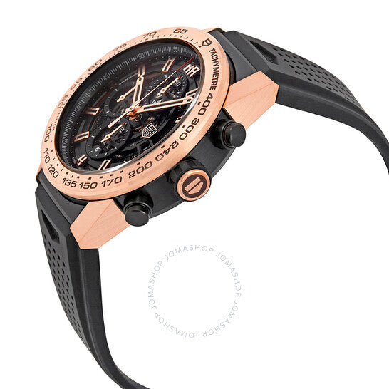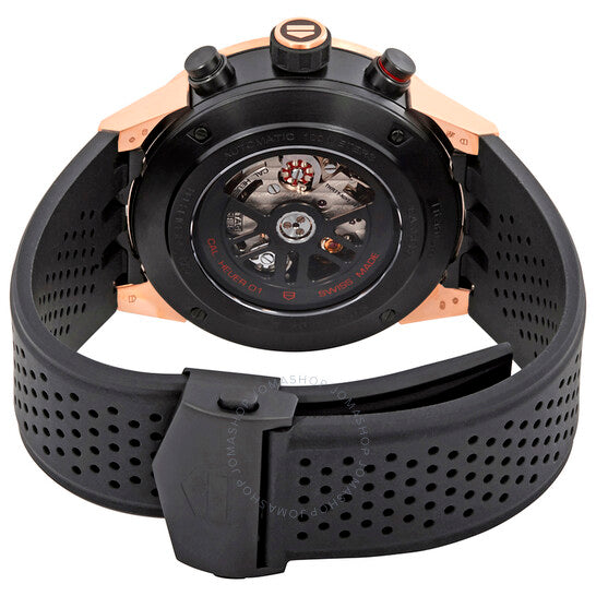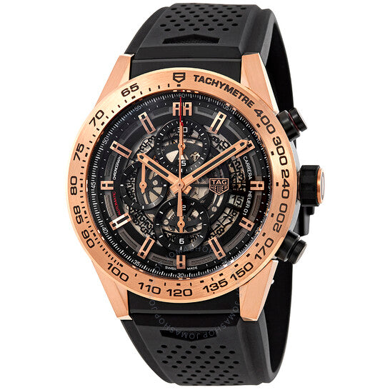 علبة من الذهب الوردي عيار ١٨ قيراطًا مع سوار مطاطي أسود. إطار من الذهب الوردي عيار ١٨ قيراطًا بمقياس سرعة ثابت. ميناء هيكلي بعقارب وعلامات ساعات ذهبية وردية اللون. مقياس سرعة. نوع الميناء: تناظري. عرض التاريخ بين موضعي الساعة ٣ و٤. كرونوغراف - ثلاثة أقراص فرعية تعرض: ٦٠ ثانية، ٣٠ دقيقة، و١٢ ساعة. حركة أوتوماتيكية من طراز TAG Heuer Calibre ٠١، مبنية على طراز TAG Heuer Calibre ١٨٨٧، تحتوي على ٣٩ جوهرة، تنبض بمعدل ٢٨٨٠٠ ذبذبة في الساعة، ولديها احتياطي طاقة يقارب ٥٠ ساعة. زجاج من الياقوت المقاوم للخدش. تاج لولبي. غطاء خلفي شفاف هيكلي. هيكل دائري الشكل، مقاسه ٤٥ مم. إبزيم قابل للطي بزر ضغط. مقاومة للماء حتى عمق ١٠٠ متر / ٣٣٠ قدمًا. الوظائف: كرونوغراف، تاريخ، ساعات، دقائق، ثوانٍ، مقياس سرعة. سلسلة كاريرا. تصميم ساعة فاخر. صناعة سويسرية. ساعة تاغ هوير كاريرا كرونوغراف أوتوماتيكية للرجال CAR2A5B.FT6044.