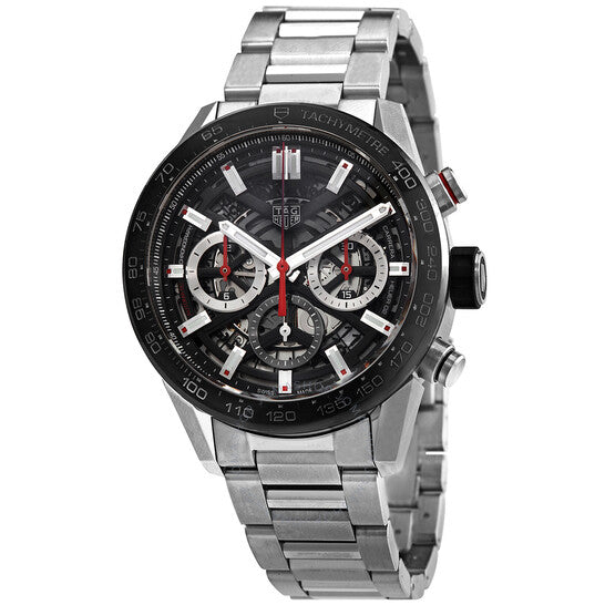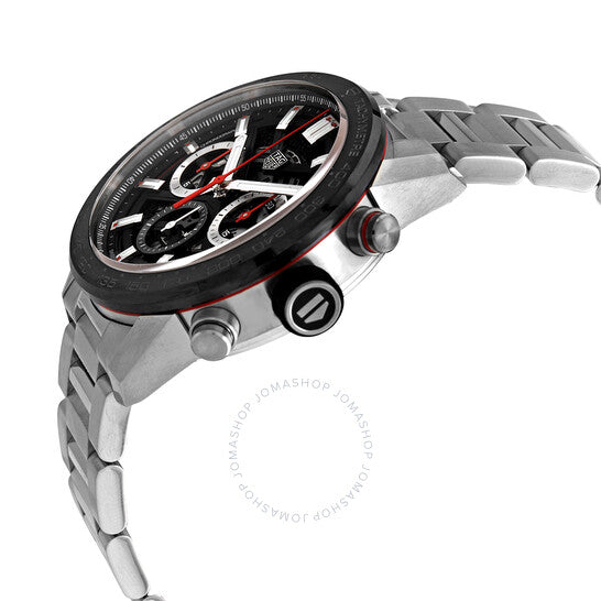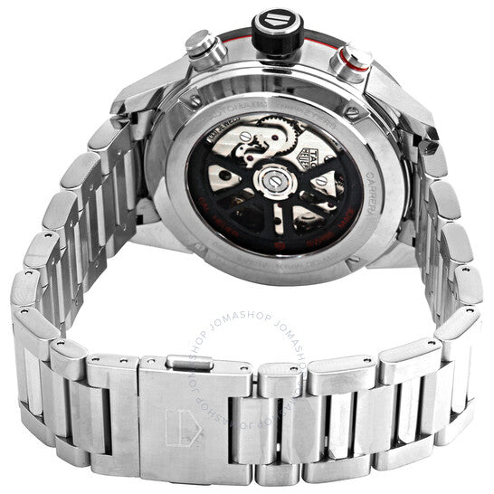 علبة من الفولاذ المقاوم للصدأ مع سوار من الفولاذ المقاوم للصدأ. إطار ثابت من الفولاذ المقاوم للصدأ مع حلقة سوداء تُظهر علامات مقياس سرعة الدوران. ميناء هيكلي بعقارب فضية مضيئة وعلامات ساعات. علامات دقائق حول الحافة الخارجية. نوع الميناء: تناظري. عقارب وعلامات مضيئة. عرض التاريخ بين موضعي الساعة 4 و5. كرونوغراف - ثلاثة أقراص فرعية تعرض: الثواني، 30 دقيقة، و12 ساعة. حركة أوتوماتيكية من تاغ هوير كاليبر 02، تحتوي على 33 جوهرة، مكونة من 168 جزءًا، تنبض بسرعة 28800 ذبذبة في الساعة، ولديها احتياطي طاقة يصل إلى 80 ساعة تقريبًا. زجاج ياقوت مقاوم للخدش. تاج قابل للسحب/الدفع. غطاء خلفي شفاف. شكل دائري. حجم الهيكل: 43 مم. مشبك قابل للطي بزر ضغط. مقاومة للماء حتى عمق 100 متر / 330 قدمًا. الوظائف: كرونوغراف، تاريخ، ساعة، دقيقة، ثانية. سلسلة كاريرا. ساعة رياضية. صناعة سويسرية. ساعة تاغ هوير كاريرا كرونوغراف أوتوماتيكية للرجال CBG2010.BA0662.