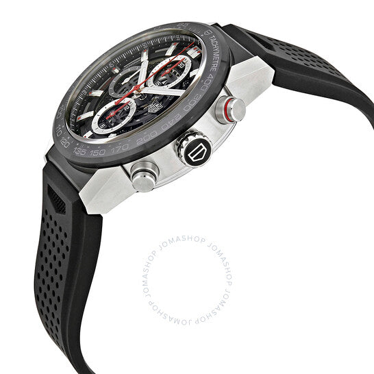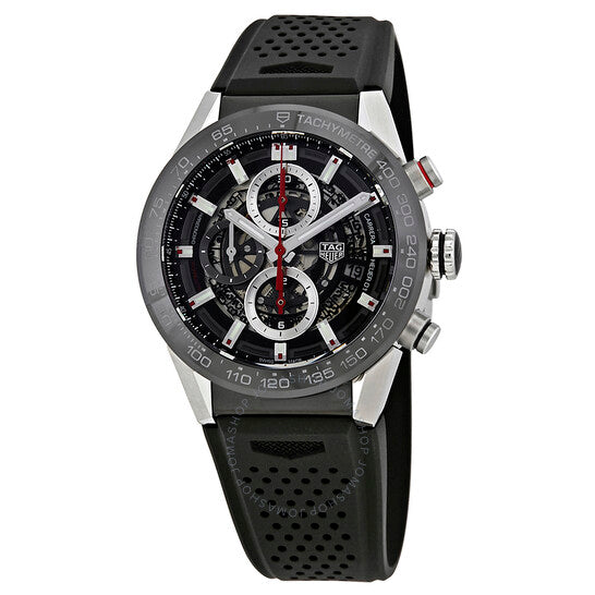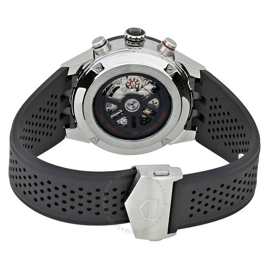 علبة من الفولاذ المقاوم للصدأ مع سوار مطاطي أسود. إطار ثابت من السيراميك الأسود يعرض علامات مقياس سرعة الدوران. ميناء هيكلي بعقارب فضية مضيئة وعلامات ساعات. علامات دقائق حول الحافة الخارجية. نوع الميناء: تناظري. عقارب وعلامات مضيئة. عرض التاريخ بين موضعي الساعة 3 و4. كرونوغراف - ثلاثة أقراص فرعية تعرض: 60 ثانية، 30 دقيقة، و12 ساعة. حركة أوتوماتيكية من طراز TAG Heuer عيار 01، مبنية على عيار TAG Heuer 1887، تحتوي على 39 جوهرة، تنبض بمعدل 28800 ذبذبة في الساعة، ولديها احتياطي طاقة لمدة 50 ساعة تقريبًا. زجاج ياقوت مقاوم للخدش. تاج قابل للسحب/الدفع. غطاء خلفي شفاف. شكل دائري. حجم الهيكل: 43 مم. سمك الهيكل: 16.5 مم. عرض السوار: 20 مم. مشبك قابل للطي. مقاومة للماء حتى عمق 100 متر / 330 قدمًا. الوظائف: كرونوغراف، مقياس سرعة الدوران، التاريخ، الساعات، الدقائق، الثواني. سلسلة كاريرا. تصميم فاخر. علامة الساعة: صناعة سويسرية. ساعة تاغ هوير كاريرا كرونوغراف أوتوماتيكية بمينا هيكلي للرجال CAR201V.FT6046.