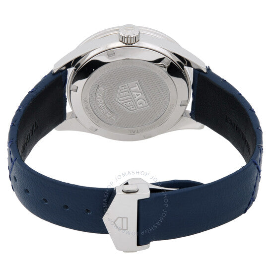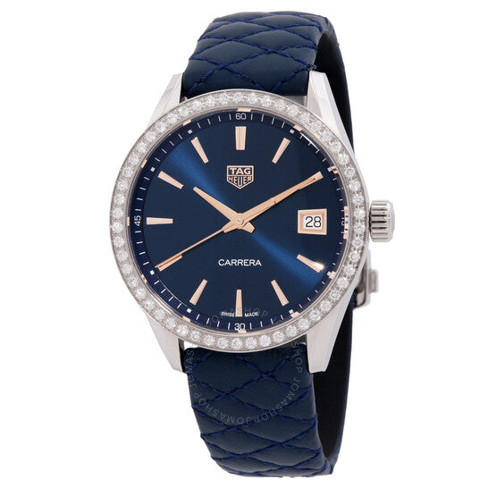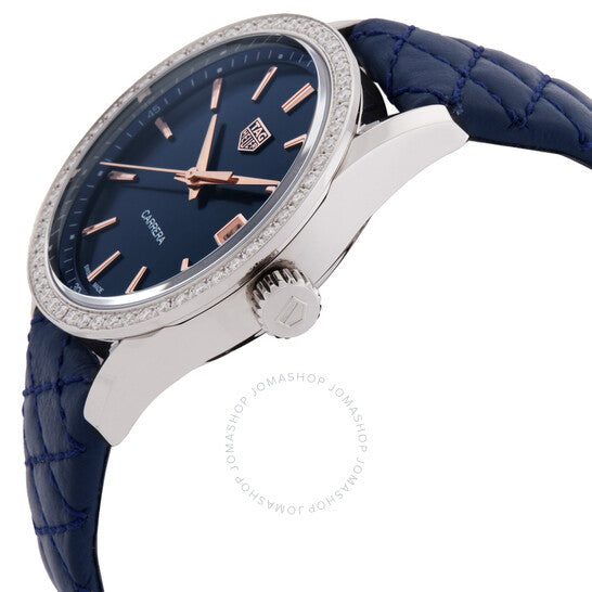 علبة من الفولاذ المقاوم للصدأ مع سوار من جلد العجل الأزرق. إطار ثابت من الفولاذ المقاوم للصدأ مرصع بـ 54 ماسة. ميناء أزرق بعقارب وعلامات ساعات مطلية بالذهب الوردي. علامات دقائق حول الحافة الخارجية. نوع الميناء: تناظري. عرض التاريخ عند موضع الساعة 3. حركة كوارتز. زجاج ياقوت مقاوم للخدش. تاج قابل للسحب/الدفع. غطاء خلفي صلب. شكل دائري. حجم العلبة: 36 مم. مشبك قابل للطي. مقاومة للماء حتى عمق 100 متر / 330 قدمًا. الوظائف: التاريخ، الساعة، الدقائق، الثواني. معلومات إضافية: إطار مرصع بـ 54 ماسة. سلسلة كاريرا. تصميم ساعة فاخرة. علامة الساعة: صناعة سويسرية. ساعة تاغ هوير كاريرا كوارتز نسائية بمينا زرقاء مرصعة بالألماس WBK1317.FC8259.