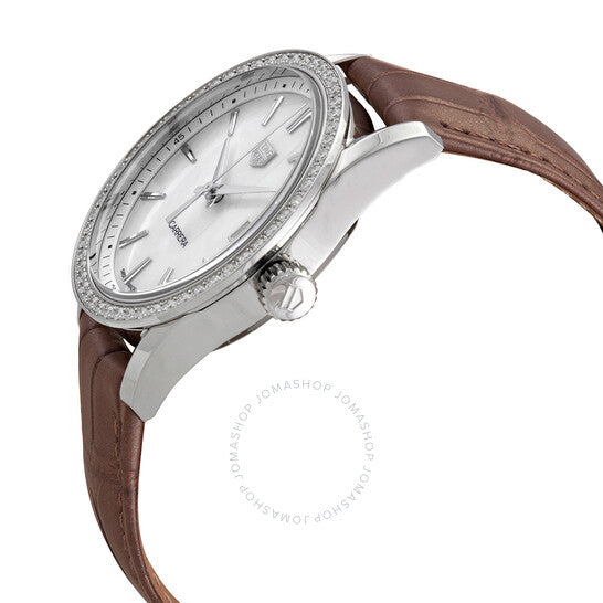 علبة من الفولاذ المقاوم للصدأ مع سوار من جلد التمساح البني. إطار ثابت من الفولاذ المقاوم للصدأ مرصع بـ 54 ماسة. ميناء من عرق اللؤلؤ مع عقارب فضية اللون وعلامات ساعات. علامات دقائق حول الحافة الخارجية. نوع الميناء: تناظري. عرض التاريخ عند موضع الساعة 3. حركة كوارتز. زجاج ياقوت مقاوم للخدش. تاج قابل للسحب/الدفع. غطاء خلفي صلب. شكل دائري. حجم العلبة: 36 مم. سمكها: 11.6 مم. عرض السوار: 18 مم. مشبك قابل للطي بزر ضغط. مقاومة للماء حتى عمق 100 متر / 330 قدمًا. الوظائف: التاريخ، الساعة، الدقائق، الثواني. سلسلة كاريرا. طراز ساعة رسمية. علامة الساعة: صناعة سويسرية. ساعة تاغ هوير كاريرا كوارتز نسائية مرصعة بالألماس WBK1316.FC8258.