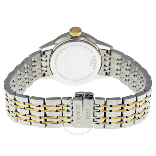علبة من الفولاذ المقاوم للصدأ مع سوار من الفولاذ المقاوم للصدأ ثنائي اللون (فضي وذهبي مطلي بتقنية PVD). إطار ثابت ثنائي اللون (فضي وذهبي). ميناء أبيض مع عقارب ذهبية اللون وعلامات ساعات. علامات دقائق حول الحافة الخارجية. نوع الميناء: تناظري. عرض التاريخ عند موضع الساعة 3. حركة كوارتز ETA 803.112. زجاج ياقوتي مقاوم للخدش. غطاء خلفي صلب. حجم العلبة: 29 مم. سمكها: 9 مم. شكلها دائري. عرض السوار: 14 مم. مشبك قابل للطي. مقاومة للماء حتى عمق 30 مترًا / 100 قدم. الوظائف: التاريخ، الساعة، الدقائق، الثواني. تصميم كاجوال. علامة الساعة: صناعة سويسرية. ساعة تيسوت كارسون نسائية ثنائية اللون بمينا أبيض T0852102201100.