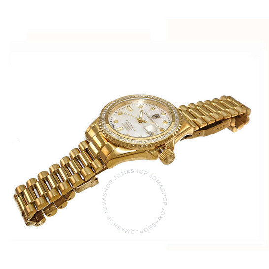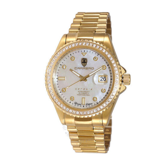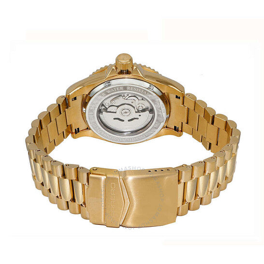ساعة تورينو كاريرو كاتانيا سافير أوتوماتيكية NH35 للرجال - 24 جوهرة، مع حجر ياقوت أزرق (69 قطعة). ميناء أبيض من عرق اللؤلؤ، لون ذهبي. هيكل وسوار من الفولاذ المقاوم للصدأ بلون ذهبي أصفر. إطار دوار أحادي الاتجاه من الفولاذ المقاوم للصدأ بلون ذهبي أصفر. ميناء أسود مع عقارب وعلامات ساعات ذهبية صفراء. علامات دقائق حول الحافة الخارجية. نوع الميناء: تناظري. عقارب وعلامات مضيئة. عرض التاريخ عند موضع الساعة 3. حركة أوتوماتيكية TMI Caliber NH35، تحتوي على 24 جوهرة، تنبض بسرعة 21600 ذبذبة في الساعة، ولديها احتياطي طاقة لمدة 41 ساعة تقريبًا. كريستال معدني مقاوم للخدش. تاج لولبي. غطاء خلفي شفاف. شكل الهيكل مستدير، حجم الهيكل: 44 مم، سمك الهيكل: 15 مم. عرض السوار: 20 مم، طول السوار: 8.25 بوصة. مشبك قابل للطي بزر ضغط. مقاومة للماء حتى عمق 200 متر / 660 قدمًا. الوظائف: التاريخ، الساعات، الدقائق، الثواني. سلسلة كاتانيا. تصميم كاجوال. علامة الساعة: Japan Movt. ساعة تورينو كاريرو كاتانيا أوتوماتيكية للرجال بمينا أسود C1G787WTJ.