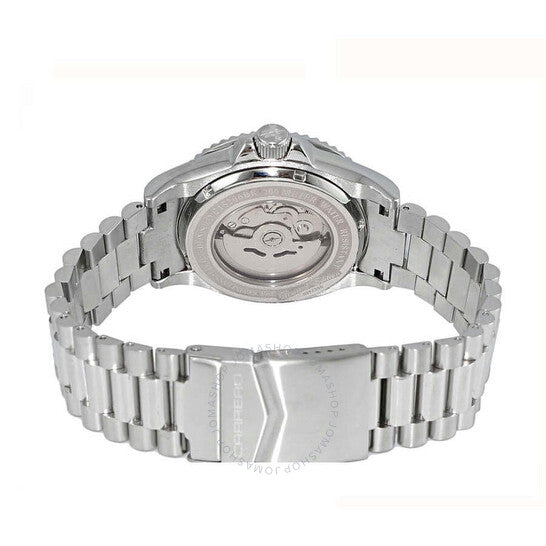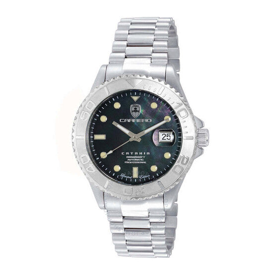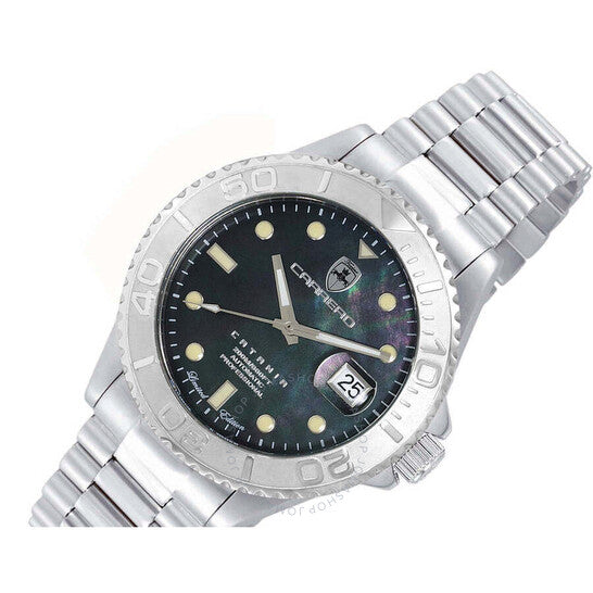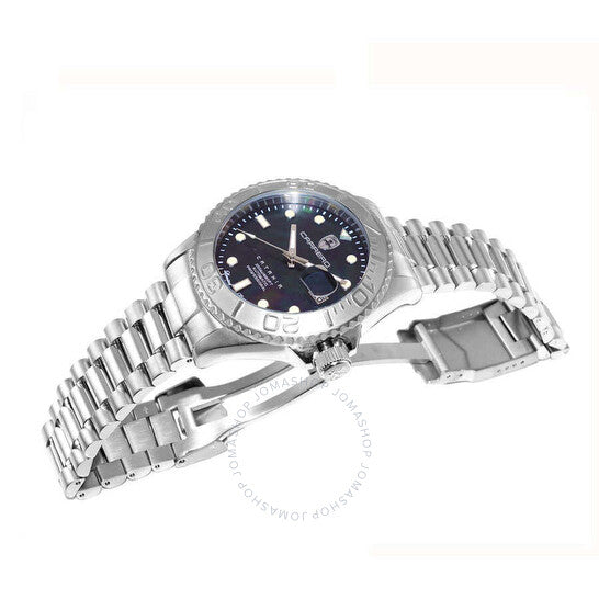 ساعة تورينو كاريرو أفاتار أوتوماتيكية للرجال NH35 - 21 جوهرة، ميناء أسود من عرق اللؤلؤ، لون فضي. هيكل وسوار من الفولاذ المقاوم للصدأ فضي اللون. إطار دوار أحادي الاتجاه من الفولاذ المقاوم للصدأ فضي اللون. ميناء أسود مع عقارب وعلامات ساعات فضية اللون. علامات دقائق حول الحافة الخارجية. نوع الميناء: تناظري. عقارب وعلامات مضيئة. عرض التاريخ عند موضع الساعة 3. حركة أوتوماتيكية TMI Caliber NH35، تحتوي على 24 جوهرة، تنبض بسرعة 21600 ذبذبة في الساعة، ولديها احتياطي طاقة لمدة 41 ساعة تقريبًا. زجاج معدني مقاوم للخدش. تاج لولبي. غطاء خلفي شفاف. هيكل دائري، مقاس الهيكل: 44 مم، سمك الهيكل: 15 مم. عرض السوار: 21.5 مم، طول السوار: 8.25 بوصة. مشبك قابل للطي بزر ضغط للفتح. مقاومة للماء حتى عمق 100 متر / 330 قدمًا. الوظائف: التاريخ، الساعة، الدقائق، الثواني. سلسلة كاتانيا. ساعة كاجوال. ماركة الساعة: Japan Movt. ساعة تورينو كاريرو كاتانيا أوتوماتيكية للرجال بمينا أسود C1S266BKJ.