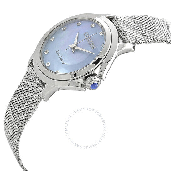 علبة من الفولاذ المقاوم للصدأ فضية اللون مع سوار شبكي فضي اللون. إطار ثابت فضي اللون. ميناء أزرق من عرق اللؤلؤ مع عقارب فضية اللون وعلامات ساعات من الألماس. نوع الميناء: تناظري. حركة سيتيزن كاليبر E031 إيكو-درايف. زجاج ياقوتي مقاوم للخدش. غطاء خلفي صلب. شكل العلبة دائري، مقاسها 32 مم. مشبك قابل للطي. مقاومة للماء حتى عمق 50 مترًا / 165 قدمًا. الوظائف: الساعات، الدقائق، الثواني. سلسلة سيسي. طراز ساعة رسمية. علامة الساعة: جابان موف. ساعة سيتيزن سيسي دايموند نسائية EM0790-55N.