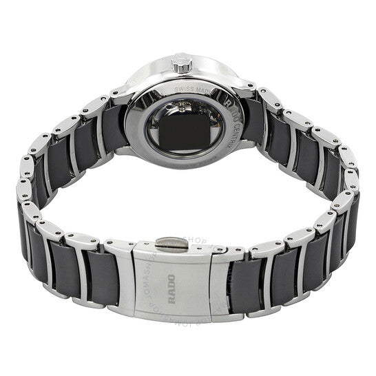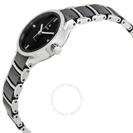 علبة من الفولاذ المقاوم للصدأ مع سوار من الفولاذ المقاوم للصدأ بوصلات سيراميك سوداء. إطار ثابت فضي اللون مرصع بالألماس. ميناء أسود بعقارب فضية اللون. مؤشرات مرصعة بالألماس عند الساعة 3، 6، 9، و12. نوع الميناء: تناظري. عرض التاريخ عند الساعة 3. آلية حركة أوتوماتيكية. زجاج ياقوت مقاوم للخدش. تاج قابل للسحب/الدفع. غطاء خلفي صلب. حجم العلبة: 28 مم. شكل دائري. مشبك قابل للطي. مقاومة للماء حتى عمق 30 مترًا / 100 قدم. الوظائف: التاريخ، الساعة، الدقائق، الثواني. تصميم ساعة فاخرة. علامة الساعة: صناعة سويسرية. ساعة رادو سنتركس أوتوماتيكية نسائية بمينا أسود مرصعة بالألماس، R30160712.