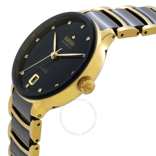علبة من الفولاذ المقاوم للصدأ بلون ذهبي، مع سوار من الفولاذ المقاوم للصدأ والسيراميك بلونين (ذهبي وأسود). إطار ثابت من الفولاذ المقاوم للصدأ بلون أسود. ميناء أسود بعقارب ذهبية اللون وعلامات ساعات من الألماس. نوع الميناء: تناظري. عرض التاريخ عند موضع الساعة السادسة. حركة أوتوماتيكية. زجاج ياقوت مقاوم للخدش. تاج قابل للسحب/الدفع. غطاء خلفي شفاف. شكل العلبة دائري، مقاسها: 35 مم، سمكها: 11.1 مم. مشبك قابل للطي بزر ضغط. مقاومة للماء حتى عمق 50 مترًا/165 قدمًا. الوظائف: التاريخ، الساعة، الدقائق، الثانية. سلسلة سنتركس. طراز ساعة رسمية. علامة الساعة: صناعة سويسرية. رقم المنتج: 01.763.6032.3.074. ساعة رادو سنتركس أوتوماتيكية نسائية بمينا أسود مرصعة بالألماس، R30032742.