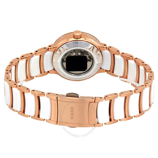 علبة من الفولاذ المقاوم للصدأ مطلية بالذهب الوردي بتقنية PVD، مع سوار من الفولاذ المقاوم للصدأ مطلي بالذهب الوردي بتقنية PVD، مع لمسات من السيراميك الأبيض عالي التقنية. إطار ثابت مطلي بالذهب الوردي بتقنية PVD. ميناء أبيض بعقارب بلون الذهب الوردي وعلامات ساعات من الألماس. نوع الميناء: تناظري. عرض التاريخ عند موضع الساعة 3. حركة أوتوماتيكية من رادو، عيار 561 (ETA 2671)، مع احتياطي طاقة لمدة 38 ساعة. زجاج من الياقوت المقاوم للخدش. تاج قابل للسحب/الدفع. غطاء خلفي شفاف. شكل دائري. حجم العلبة: 28 مم. سمكها: 9.3 مم. مشبك قابل للطي بزر ضغط. مقاومة للماء حتى عمق 30 مترًا / 100 قدم. الوظائف: التاريخ، الساعة، الدقائق، الثواني. طراز ساعة رسمية. علامة الساعة: صناعة سويسرية. ساعة رادو سنتركس أوتوماتيكية نسائية بمينا بيضاء مرصعة بالألماس، R30183742.