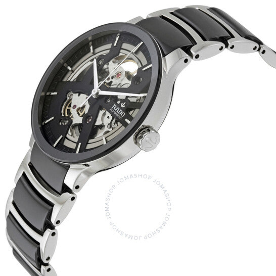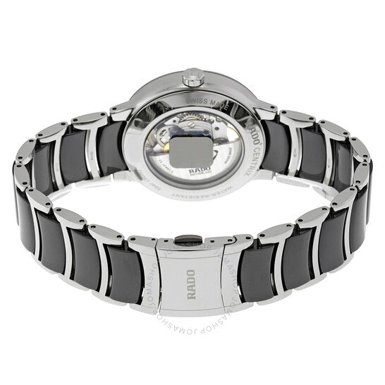 علبة من الفولاذ المقاوم للصدأ مع سوار من الفولاذ المقاوم للصدأ بلمسات من السيراميك الأسود. إطار ثابت من السيراميك الأسود. ميناء أسود (قلب مفتوح) بعقارب فضية اللون وعلامات ساعات. علامات دقائق حول الحافة الخارجية. نوع الميناء: تناظري. حركة أوتوماتيكية من رادو عيار 734 مع احتياطي طاقة يصل إلى 80 ساعة. زجاج من الياقوت المقاوم للخدش. تاج قابل للسحب/الدفع. غطاء خلفي شفاف. حجم العلبة: 38 مم. سمكها: 10.1 مم. شكلها دائري. عرض السوار: 20 مم. مشبك قابل للطي. مقاومة للماء حتى عمق 30 مترًا / 100 قدم. الوظائف: الساعات، الدقائق، الثواني. معلومات إضافية: رقم المرجع: 734.0178.3.015. طراز ساعة فاخر. علامة الساعة: صناعة سويسرية. ساعة رادو سنتركس سوداء بمينا هيكلي للرجال، رقم الموديل R30178152.