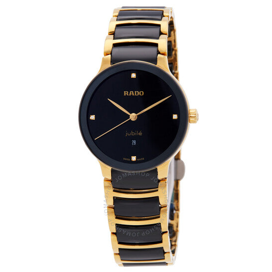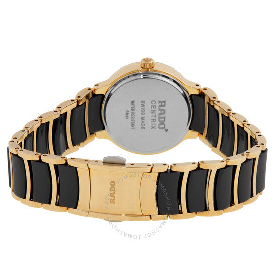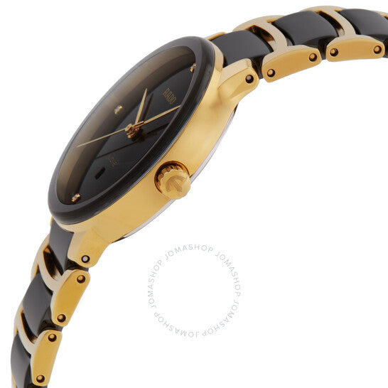 علبة من الفولاذ المقاوم للصدأ/PVD بلونين (أسود وذهبي) مع سوار من السيراميك عالي التقنية بلونين (أسود وذهبي) وستانلس ستيل/PVD. إطار ثابت من الفولاذ المقاوم للصدأ/PVD أسود اللون. ميناء أسود بعقارب ذهبية اللون وعلامات ساعات من الألماس. نوع الميناء: تناظري. عرض التاريخ عند موضع الساعة السادسة. حركة كوارتز. زجاج ياقوتي مقاوم للخدش. غطاء خلفي صلب. شكل دائري، مقاس العلبة: 30.5 مم، سمكها: 8.90 مم. مشبك قابل للطي. مقاومة للماء حتى عمق 50 مترًا/165 قدمًا. الوظائف: التاريخ، الساعة، الدقيقة، الثانية. سلسلة سنتركس دايموندز. طراز ساعة رسمية. علامة الساعة: صناعة سويسرية. رقم المنتج: 01.079.6025.3.071. ساعة رادو سنتركس دايموندز كوارتز نسائية بمينا سوداء، R30025712.