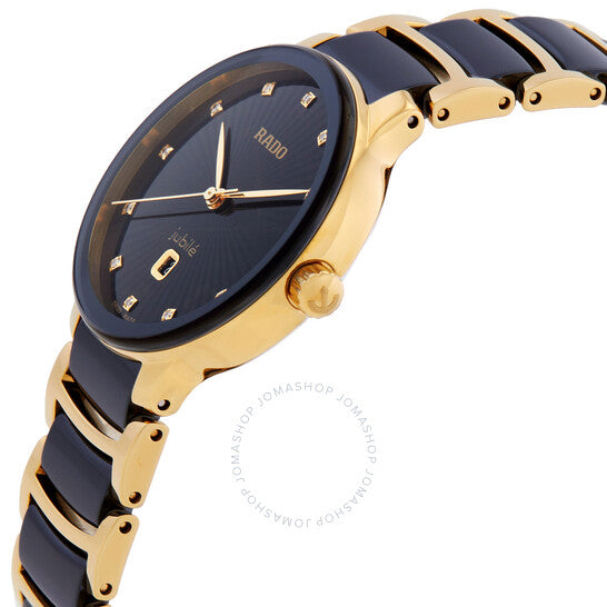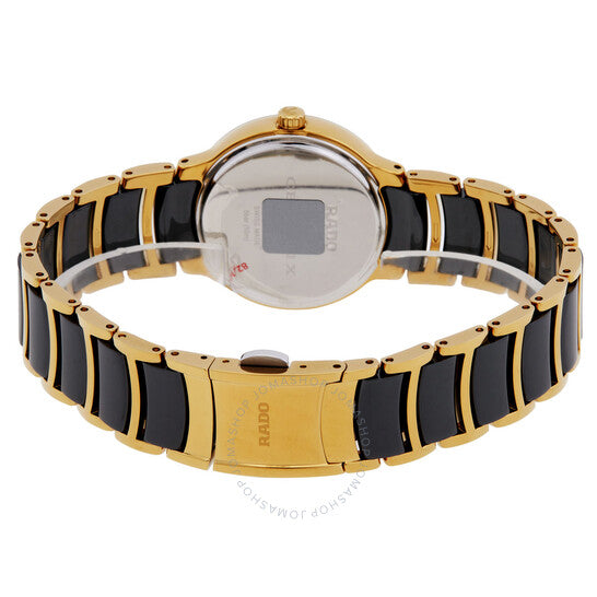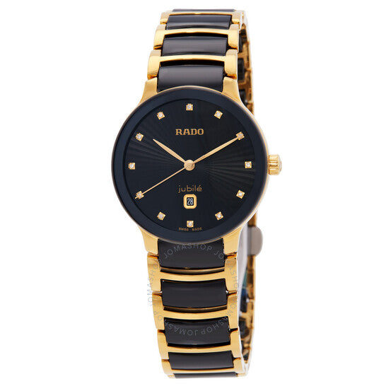 علبة من الفولاذ المقاوم للصدأ/PVD بلونين (أسود وذهبي) مع سوار من السيراميك عالي التقنية بلونين (أسود وذهبي) وستانلس ستيل/PVD. إطار ثابت من الفولاذ المقاوم للصدأ/PVD أسود اللون. ميناء أسود بعقارب ذهبية اللون وعلامات ساعات من الماس. نوع الميناء: تناظري. عرض التاريخ عند موضع الساعة السادسة. حركة كوارتز. زجاج ياقوتي مقاوم للخدش. غطاء خلفي صلب. شكل دائري، مقاس العلبة: 30.5 مم، سمكها: 8.90 مم. مشبك قابل للطي. مقاومة للماء حتى عمق 50 مترًا/165 قدمًا. الوظائف: التاريخ، الساعة، الدقيقة، الثانية. سلسلة سنتركس دايموندز. طراز ساعة رسمية. علامة الساعة: صناعة سويسرية. رقم المنتج: 01.079.6025.3.074. ساعة رادو سنتركس دايموندز كوارتز نسائية بمينا سوداء، R30025742.