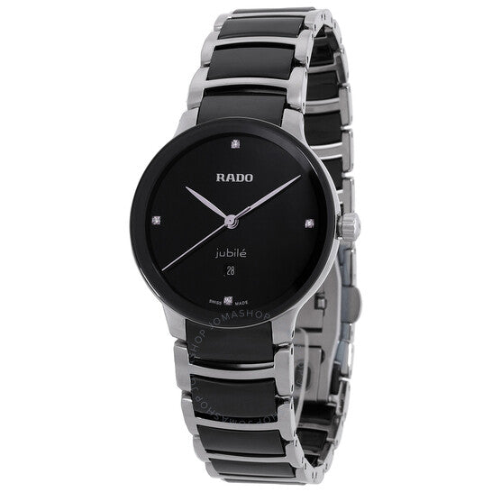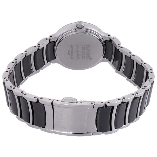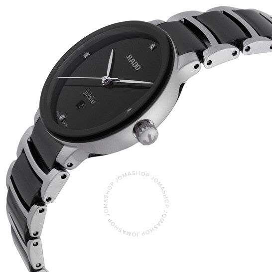 علبة فضية اللون من الفولاذ المقاوم للصدأ، مع سوار ثنائي اللون (أسود وفضي) من الفولاذ المقاوم للصدأ والسيراميك. إطار ثابت من السيراميك الأسود. ميناء أسود بعقارب فضية اللون وعلامات ساعات من الألماس. نوع الميناء: تناظري. عرض التاريخ عند موضع الساعة السادسة. حركة كوارتز. زجاج ياقوتي مقاوم للخدش. هيكل دائري، مقاسه: 30 مم، سُمكه: 8.9 مم. مشبك قابل للطي مع قفل أمان. مقاومة للماء حتى عمق 50 مترًا / 165 قدمًا. الوظائف: التاريخ، الساعة، الدقائق، الثانية. معلومات إضافية: العلبة الأصلية، بطاقة الضمان الدولية، دليل الاستخدام (ملحقات كاملة). سلسلة سنتركس دايموندز. تصميم ساعة فاخرة. علامة الساعة: صناعة سويسرية. ساعة رادو سنتركس دايموندز كوارتز نسائية بمينا سوداء، رقم الموديل R30026712.