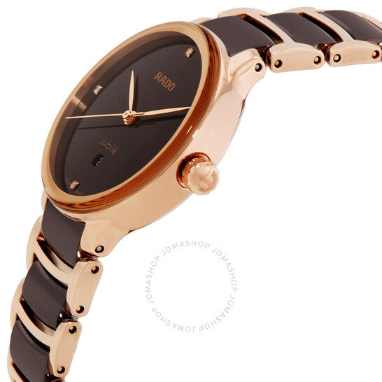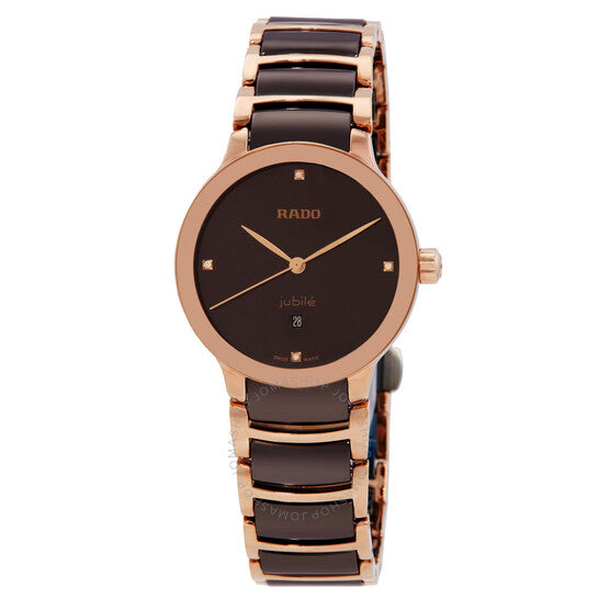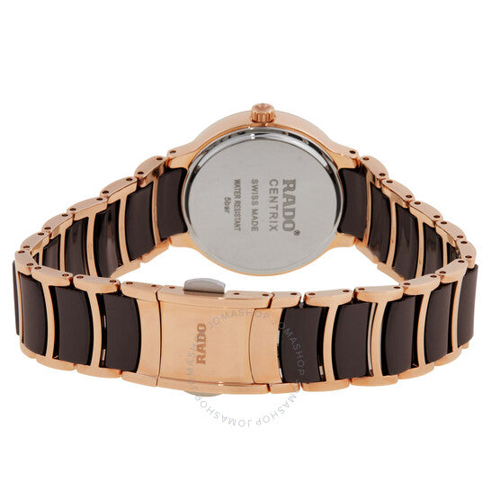 علبة من الفولاذ المقاوم للصدأ/مطلية بتقنية PVD بلونين (بني وذهبي وردي) مع سوار من السيراميك عالي التقنية بلونين (بني وذهبي وردي). إطار ثابت من الفولاذ المقاوم للصدأ/مطلي بتقنية PVD بلون ذهبي وردي. ميناء بني مع عقارب بلون ذهبي وردي وعلامات ساعات من الألماس. نوع الميناء: تناظري. عرض التاريخ عند موضع الساعة السادسة. حركة كوارتز من رادو كاليبر R079. زجاج ياقوت مقاوم للخدش. غطاء خلفي صلب. شكل دائري، مقاس العلبة: 30.5 مم، سمكها: 8.90 مم. مشبك قابل للطي. مقاومة للماء حتى عمق 50 مترًا/165 قدمًا. الوظائف: التاريخ، الساعة، الدقيقة، الثانية. سلسلة سنتركس دايموندز. طراز ساعة رسمية. علامة الساعة: صناعة سويسرية. تنوعات المنتج: 01.079.6024.3.071. ساعة رادو سنتركس دايموندز كوارتز نسائية بمينا بني، R30024712.