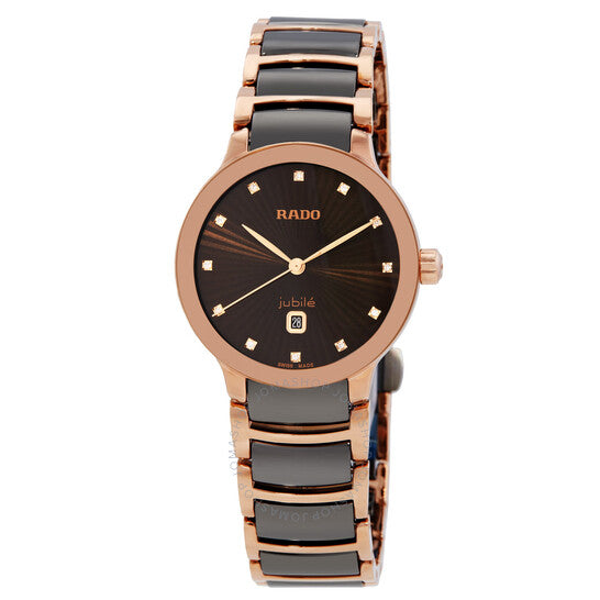 علبة من الفولاذ المقاوم للصدأ/مطلية بتقنية PVD بلونين (بني وذهبي وردي) مع سوار من السيراميك عالي التقنية بلونين (بني وذهبي وردي). إطار ثابت من الفولاذ المقاوم للصدأ/مطلي بتقنية PVD بلون ذهبي وردي. ميناء بني مع عقارب بلون ذهبي وردي وعلامات ساعات من الألماس. نوع الميناء: تناظري. عرض التاريخ عند موضع الساعة السادسة. حركة كوارتز من رادو كاليبر R079. زجاج ياقوت مقاوم للخدش. غطاء خلفي صلب. شكل دائري، مقاس العلبة: 30.5 مم، سمكها: 8.90 مم. مشبك قابل للطي. مقاومة للماء حتى عمق 50 مترًا/165 قدمًا. الوظائف: التاريخ، الساعة، الدقيقة، الثانية. سلسلة سنتركس دايموندز. طراز ساعة رسمية. علامة الساعة: صناعة سويسرية. رقم المنتج: 01.079.6024.3.073. ساعة رادو سنتركس دايموندز كوارتز نسائية بمينا بني، R30024732.