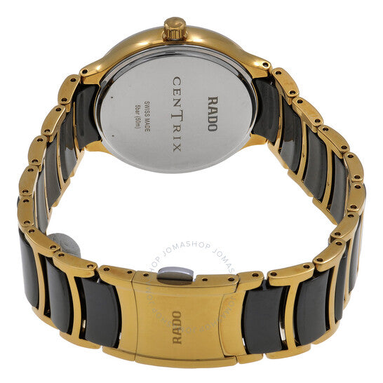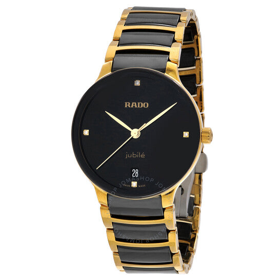 علبة من الفولاذ المقاوم للصدأ بلون ذهبي، مع سوار من الفولاذ المقاوم للصدأ والسيراميك بلونين (ذهبي وأسود). إطار ثابت من الفولاذ المقاوم للصدأ بلون أسود. ميناء أسود بعقارب ذهبية اللون وعلامات ساعات من الألماس. نوع الميناء: تناظري. عرض التاريخ عند موضع الساعة السادسة. حركة كوارتز من رادو كاليبر 073. زجاج ياقوت مقاوم للخدش. تاج قابل للسحب/الدفع. غطاء خلفي صلب. شكل دائري، مقاس العلبة: 35 مم، سمكها: 9.5 مم. مشبك قابل للطي بزر ضغط. مقاومة للماء حتى عمق 50 مترًا / 165 قدمًا. الوظائف: التاريخ، الساعة، الدقائق، الثواني. سلسلة سنتركس. طراز ساعة رسمية. علامة الساعة: صناعة سويسرية. ساعة رادو سنتركس كوارتز نسائية مرصعة بالألماس بمينا سوداء R30039712.