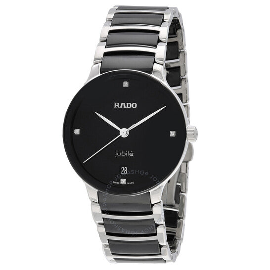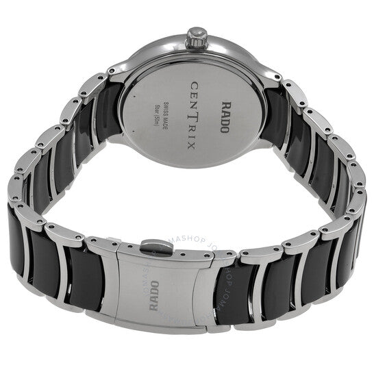 علبة من الفولاذ المقاوم للصدأ فضية اللون، مع سوار من الفولاذ المقاوم للصدأ والسيراميك ثنائي اللون (فضي وأسود). إطار ثابت من الفولاذ المقاوم للصدأ أسود اللون. ميناء أسود بعقارب فضية اللون وعلامات ساعات من الألماس. نوع الميناء: تناظري. عرض التاريخ عند موضع الساعة السادسة. حركة كوارتز من رادو كاليبر 073. زجاج ياقوت مقاوم للخدش. تاج قابل للسحب/الدفع. غطاء خلفي صلب. شكل دائري، مقاس العلبة: 35 مم، سمكها: 9.5 مم. مقاومة للماء حتى عمق 50 مترًا / 165 قدمًا. الوظائف: التاريخ، الساعة، الدقائق، الثواني. سلسلة سنتركس. طراز ساعة رسمية. علامة الساعة: صناعة سويسرية. ساعة رادو سنتركس كوارتز نسائية بمينا سوداء مرصعة بالألماس، R30040712.