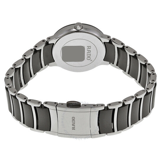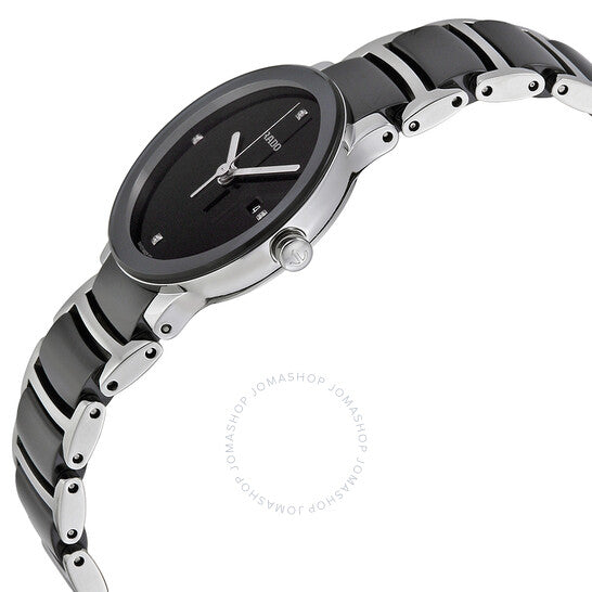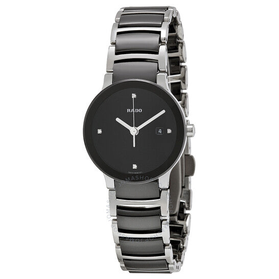علبة من السيراميك الأسود مع سوار من الفولاذ المقاوم للصدأ بلمسات من السيراميك الأسود. إطار ثابت من السيراميك الأسود. ميناء أسود بعقارب فضية اللون. مرصع بالألماس عند الساعات 3 و6 و9 و12. يظهر اسم رادو أسفل موضع الساعة 12. نوع الميناء: تناظري. يظهر عرض التاريخ عند موضع الساعة 3. آلية حركة كوارتز. زجاج ياقوت مقاوم للخدش. تاج قابل للدفع والسحب. غطاء خلفي صلب. أبعاد العلبة: 28 مم × 31.1 مم. سُمك العلبة: 6.5 مم. شكل دائري. عرض السوار: 18 مم. مشبك قابل للطي. مقاومة للماء حتى عمق 30 مترًا / 100 قدم. الوظائف: الساعات، الدقائق، الثواني، التاريخ. تصميم كاجوال. ساعة رادو سنتركس كوارتز نسائية R30935712.