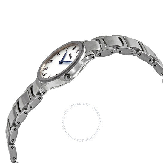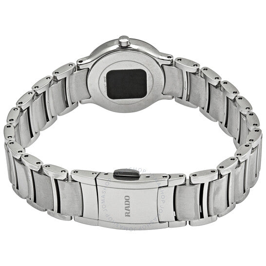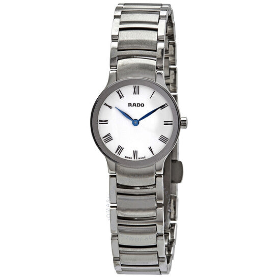 علبة من الفولاذ المقاوم للصدأ مع سوار من الفولاذ المقاوم للصدأ. إطار ثابت من الفولاذ المقاوم للصدأ. ميناء أبيض بعقارب زرقاء وعلامات ساعات بأرقام رومانية. نوع الميناء: تناظري. حركة كوارتز. زجاج ياقوت مقاوم للخدش. تاج قابل للسحب/الدفع. غطاء خلفي صلب. شكل دائري. حجم العلبة: ٢٣ مم. سُمكها: ٦.١ مم. مشبك قابل للطي بزر ضغط للفك. مقاومة للماء حتى عمق ٣٠ مترًا / ١٠٠ قدم. الوظائف: الساعات، الدقائق. سلسلة سنتركس. تصميم ساعة كاجوال. علامة الساعة: صناعة سويسرية. ساعة رادو سنتركس كوارتز نسائية بمينا بيضاء، R30185013.