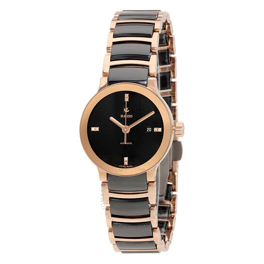 علبة من الفولاذ المقاوم للصدأ مطلية بالذهب الوردي، مطلية بتقنية PVD، مع سوار من الفولاذ المقاوم للصدأ مطلي بالذهب الوردي، مزين بلمسات من السيراميك الأسود. إطار ثابت مطلي بالذهب الوردي بتقنية PVD. ميناء أسود بعقارب مطلية بالذهب الوردي. مرصعة بماساتين عند مواضع الساعات 3 و6 و9 و12. نوع الميناء: تناظري. نافذة عرض التاريخ عند موضع الساعة 3. حركة أوتوماتيكية من عيار ETA 2671، تحتوي على 25 جوهرة، تنبض بتردد 28800 ذبذبة في الساعة، وتحتفظ باحتياطي طاقة يدوم حوالي 38 ساعة. زجاج من الياقوت المقاوم للخدش. تاج قابل للسحب/الدفع. غطاء خلفي شفاف. شكل دائري. حجم العلبة: 28 مم. سمكها: 9.3 مم. مشبك قابل للطي. مقاومة للماء حتى عمق 30 مترًا / 100 قدم. الوظائف: التاريخ، الساعة، الدقيقة، الثانية. سلسلة Centrix S. تصميم ساعة فاخرة. علامة الساعة: صناعة سويسرية. ساعة رادو Centrix S أوتوماتيكية بمينا سوداء للسيدات، R30183712.