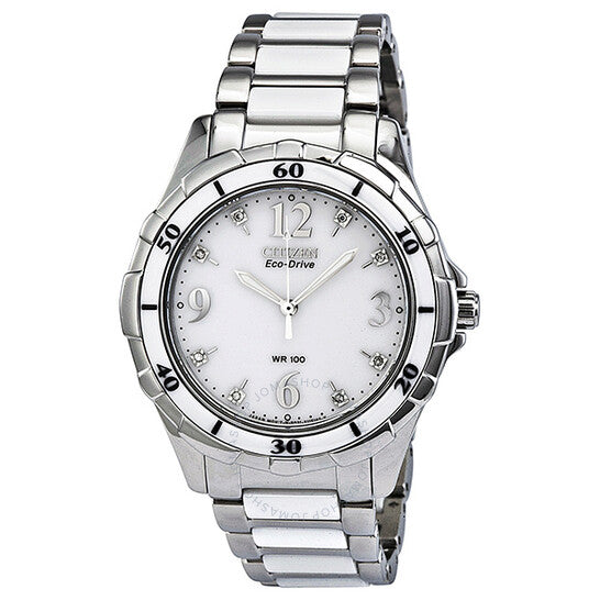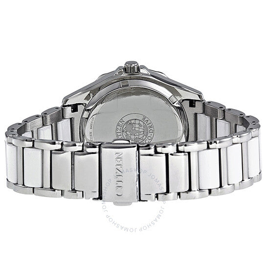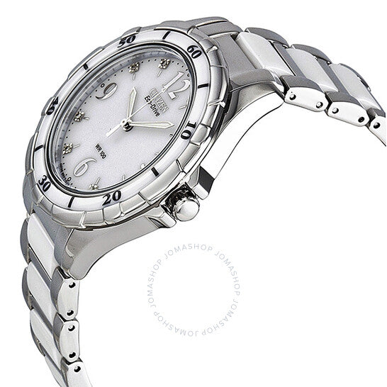 علبة من الفولاذ المقاوم للصدأ مع سوار من الفولاذ المقاوم للصدأ والسيراميك. إطار ثابت. ميناء أبيض بعقارب فضية اللون وعلامات ساعات من الماس. أرقام عربية تُشير إلى مواقع الساعات 3 و6 و9 و12. علامات دقائق حول الحافة الخارجية. نوع الميناء: تناظري. عقارب وعلامات مضيئة. آلية إيكو درايف. زجاج معدني مقاوم للخدش. تاج قابل للسحب/الدفع. غطاء خلفي صلب. قطر العلبة: 38 مم. سُمكها: 10 مم. شكلها دائري. عرض السوار: 19 مم. مشبك قابل للطي بزر ضغط. مقاومة للماء حتى عمق 100 متر / 330 قدمًا. وظائفها: الساعات، الدقائق، الثواني. تصميم كاجوال. ساعة سيتيزن سيراميك إيكو درايف نسائية بمينا بيضاء مرصعة بالألماس، EM0030-59A.