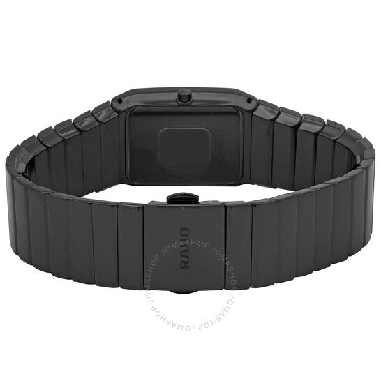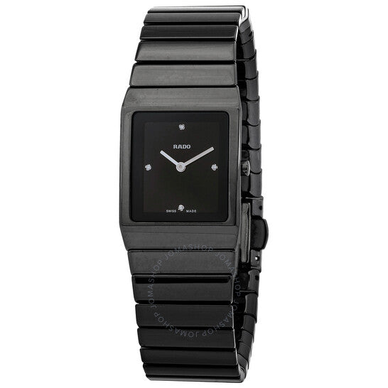 علبة من السيراميك الأسود مع سوار من السيراميك الأسود. إطار أسود ثابت. ميناء أسود بعقارب فضية اللون وعلامات ساعات مرصعة بالألماس. نوع الميناء: تناظري. حركة كوارتز. زجاج ياقوتي مقاوم للخدش. مقاس العلبة: ٢٢.٩ × ٣١.٧ مم. شكل العلبة مربع. مقاومة للماء حتى عمق ٥٠ مترًا / ١٦٥ قدمًا. الوظائف: الساعات، الدقائق. طراز ساعة رسمية. علامة الساعة: صناعة سويسرية. ساعة رادو سيراميكا نسائية بمينا أسود R21702702.