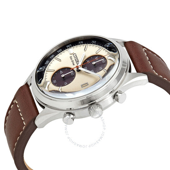 علبة من الفولاذ المقاوم للصدأ مع سوار جلدي بني. إطار ثابت من الفولاذ المقاوم للصدأ. ميناء بيج مع عقارب وعلامات ساعات فضية مضيئة. علامات دقائق. علامات سرعة الدوران حول الحافة الخارجية. نوع الميناء: تناظري. عقارب وعلامات مضيئة. عرض التاريخ عند موضع الساعة 3. كرونوغراف - ميناءان فرعيان أسودان يعرضان: 60 ثانية و30 دقيقة. حركة سيتيزن عيار B642 إيكو-درايف. زجاج معدني مقاوم للخدش. تاج قابل للسحب/الدفع. غطاء خلفي صلب. شكل دائري. حجم الهيكل: 43 مم. سمك الهيكل: 13.6 مم. عرض السوار: 22 مم. مشبك تانغ. مقاومة للماء حتى عمق 100 متر / 330 قدمًا. الوظائف: كرونوغراف، تاكيميتر، تاريخ، ساعة، دقيقة، ثانية. معلومات إضافية: تستخدم تقنية إيكو درايف - تعمل بأي ضوء ولا تحتاج إلى بطارية. تصميم كاجوال. علامة الساعة: Japan Movt. ساعة سيتيزن تشاندلر إيكو درايف كرونوغراف للرجال CA7020-07A.