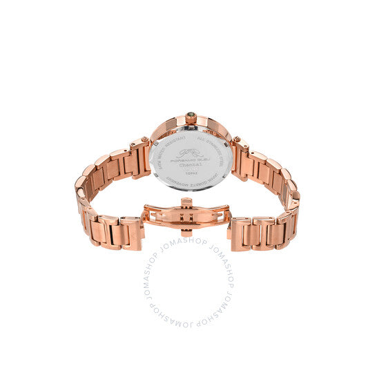 علبة وسوار من الفولاذ المقاوم للصدأ بلون الذهب الوردي. إطار ثابت من الفولاذ المقاوم للصدأ بلون الذهب الوردي. ميناء من عرق اللؤلؤ مع عقارب بلون الذهب الوردي وعلامات ساعات من التوباز. نوع الميناء: تناظري. حركة كوارتز ميوتا كاليبر 2025. زجاج معدني مقاوم للخدش. غطاء خلفي صلب. شكل العلبة دائري، مقاسها: 38 مم. مشبك قابل للطي بزر ضغط. مقاومة للماء حتى عمق 50 مترًا / 165 قدمًا. الوظائف: الساعات والدقائق. معلومات إضافية: علامات ساعات من أحجار التوباز الطبيعية الأصلية. سلسلة شانتال. تصميم ساعة فاخر. علامة الساعة: Japan Movt. ساعة شانتال كوارتز نسائية بورسامو بلو 671CCHS.