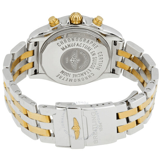 علبة وسوار من الفولاذ المقاوم للصدأ والذهب عيار ١٨ قيراطًا. إطار دوار أحادي الاتجاه من الفولاذ والذهب عيار ١٨ قيراطًا. ميناء من عرق اللؤلؤ مع عقارب ذهبية اللون وعلامات ساعات بأرقام رومانية. علامات دقائق حول الحافة الخارجية. نوع الميناء: تناظري. عقارب وعلامات مضيئة. عرض التاريخ عند موضع الساعة ٣. كرونوغراف - ثلاثة أقراص فرعية تعرض: ٦٠ ثانية، ٣٠ دقيقة، و١٢ ساعة. حركة بريتلينغ كاليبر ١٣ أوتوماتيكية، مبنية على ETA Valjoux ٧٧٥٠، تحتوي على ٢٥ جوهرة، تنبض بتردد ٢٨٨٠٠ ذبذبة في الساعة، ولديها احتياطي طاقة لمدة ٤٢ ساعة تقريبًا. كريستال ياقوت مقاوم للخدش. غطاء خلفي صلب. شكل العلبة دائري، مقاسها: ٣٩ مم، سمكها: ١٦.١ مم. عرض السوار: ٢٠-١٨ مم. مشبك تانغ. مقاومة للماء حتى عمق ١٠٠ متر / ٣٣٠ قدمًا. الوظائف: كرونوغراف، كرونومتر، تاريخ، ساعات، دقائق، ثوانٍ. سلسلة كرونو كوكبيت. تصميم ساعة فاخر. علامة الساعة: صناعة سويسرية. ساعة بريتلينغ كرونو كوكبيت كرونوغراف أوتوماتيكية كرونومتر للرجال B1335812/A597.366D.