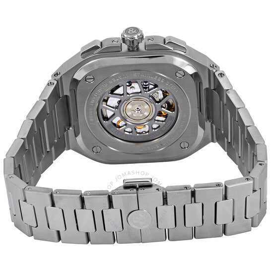 علبة من الفولاذ المقاوم للصدأ مع سوار من الفولاذ المقاوم للصدأ. إطار ثابت من الفولاذ المقاوم للصدأ. ميناء أزرق مع عقارب مضيئة فضية اللون ومؤشرات ساعات. تظهر الأرقام العربية عند موضعي الساعة 6 و12. علامات الدقائق. علامات الدقائق بالأرقام العربية (بفاصل 5 دقائق) حول الحافة الخارجية. نوع الميناء: تناظري. عقارب ومؤشرات مضيئة. عرض التاريخ بين موضعي الساعة 4 و5. كرونوغراف - ميناءان فرعيان يعرضان: 60 ثانية و30 دقيقة. حركة أوتوماتيكية من بيل آند روس، عيار BR-CAL.301، مبنية على ETA 2894-2، تحتوي على 37 جوهرة، تنبض بمعدل 28800 ذبذبة في الساعة، ولديها احتياطي طاقة لمدة 42 ساعة تقريبًا. زجاج من الياقوت المقاوم للخدش. تاج لولبي. ظهر هيكل هيكلي. شكل العلبة مربع. حجم العلبة: 42 مم × 42 مم. سمك العلبة: 11 مم. مشبك قابل للطي مع آلية تحرير آمنة. مقاومة للماء حتى عمق 100 متر / 330 قدمًا. الوظائف: كرونوغراف، تاريخ، ساعات، دقائق، ثوانٍ. تصميم فاخر. علامة الساعة: صناعة سويسرية. ساعة بيل آند روس كرونوغراف أوتوماتيكية للرجال بمينا أزرق BR05C-BU-ST/SST.