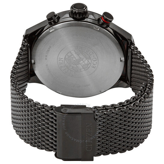 علبة من الفولاذ المقاوم للصدأ مطلية باللون الأسود مع سوار شبكي من الفولاذ المقاوم للصدأ مطلي باللون الأسود. إطار ثابت مطلي باللون الأسود. ميناء أسود بعقارب فضية مضيئة وعلامات ساعات. علامات دقائق. علامات تاكيميتر حول الحافة الخارجية. نوع الميناء: تناظري. عقارب مضيئة. عرض التاريخ عند موضع الساعة 3. كرونوغراف - ميناءان فرعيان يعرضان: 60 دقيقة و60 ثانية. حركة سيتيزن عيار B642 إيكو-درايف. زجاج معدني مقاوم للخدش. تاج قابل للسحب/الدفع. غطاء خلفي صلب. شكل دائري. حجم الهيكل: 43 مم. سمك الهيكل: 11 مم. مشبك قابل للطي. مقاومة للماء حتى عمق 100 متر / 330 قدمًا. الوظائف: كرونوغراف، تاكيميتر، تاريخ، ساعة، دقيقة، ثانية. تصميم كاجوال. ساعة سيتيزن كرونوغراف إيكو-درايف للرجال بمينا سوداء CA7015-82E.
