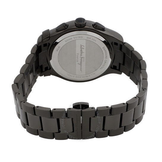 علبة وسوار من الفولاذ المقاوم للصدأ باللون الأسود. إطار ثابت من الفولاذ المقاوم للصدأ باللون الأسود. ميناء أزرق بعقارب فضية اللون ومؤشرات ساعات بأرقام عربية. مؤشرات دقائق حول الحافة الخارجية. نوع الميناء: تناظري. عقارب ومؤشرات مضيئة. عرض التاريخ عند موضع الساعة السادسة. كرونوغراف - ثلاثة موانئ فرعية تعرض: 60 ثانية، 30 دقيقة، و1/10 من الثانية. حركة كوارتز. زجاج ياقوتي مقاوم للخدش. غطاء خلفي صلب. شكل دائري، مقاس العلبة: 42 مم، سمكها: 11.25 مم. طول السوار: 8.5 بوصة. مشبك قابل للطي بزر ضغط. مقاومة للماء حتى عمق 30 مترًا / 100 قدم. الوظائف: كرونوغراف، تاريخ، ساعة، دقيقة، ثانية. طراز ساعة رياضية. علامة الساعة: صناعة سويسرية. ساعة سلفاتوري فيراغامو كرونوغراف كوارتز زرقاء للرجال SFDK00518.