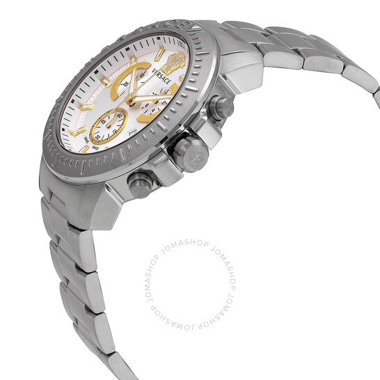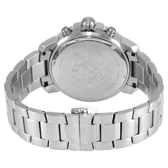 علبة وسوار من الفولاذ المقاوم للصدأ فضي اللون. إطار من الفولاذ المقاوم للصدأ فضي اللون. ميناء فضي بتصميم أشعة الشمس مع عقارب ومؤشرات ساعات ذهبية اللون. رأس ميدوسا يُشير إلى موضع الساعة ١٢. مؤشرات دقائق حول الحافة الخارجية. نوع الميناء: تناظري. عقارب ومؤشرات مضيئة. عرض التاريخ عند موضع الساعة ٤. كرونوغراف - ثلاثة موانئ فرعية تعرض: ٦٠ ثانية، ٣٠ دقيقة، وعُشر الثانية. حركة كوارتز. زجاج ياقوت مقاوم للخدش. تاج قابل للسحب/الدفع. هيكل دائري، مقاسه: ٤٥ مم، سُمكه: ١٢ مم. عرض السوار: ٢٢ مم. مشبك قابل للطي. مقاومة للماء حتى عمق ٥٠ مترًا / ١٦٥ قدمًا. الوظائف: كرونوغراف، تاريخ، ساعة، دقيقة، ثانية. طراز ساعة رياضية. علامة الساعة: صناعة سويسرية. ساعة فيرساتشي كرونوغراف كوارتز فضية للرجال VE2E00321.