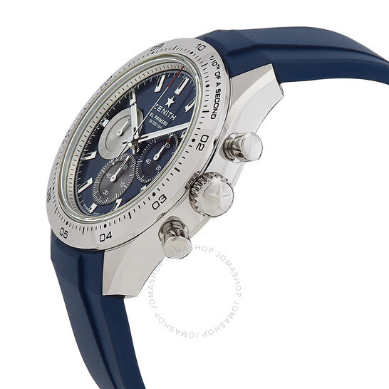 علبة فضية اللون من الفولاذ المقاوم للصدأ مع سوار مطاطي أزرق. إطار ثابت فضي اللون من الفولاذ المقاوم للصدأ. ميناء أزرق مع عقارب وعلامات ساعات فضية اللون. علامات دقائق حول الحافة الخارجية. نوع الميناء: تناظري. عقارب وعلامات مضيئة. عرض التاريخ بين موضعي الساعة 4 و5. كرونوغراف - ثلاثة أقراص فرعية تعرض: 60 ثانية، 60 دقيقة، و1/10 من الثانية. حركة أوتوماتيكية Zenith Calibre El Primero 3600، تحتوي على 35 جوهرة، مكونة من 311 جزءًا، تنبض بمعدل 36000 ذبذبة في الساعة، ولديها احتياطي طاقة لمدة 60 ساعة تقريبًا. زجاج ياقوت مقاوم للخدش. غطاء خلفي شفاف. شكل العلبة دائري، مقاس العلبة: 41 مم، سمكها: 13.60 مم. مشبك تانغ. مقاومة للماء حتى عمق 100 متر / 330 قدمًا. الوظائف: كرونوغراف، تاريخ، ساعة، دقيقة، ثانية. سلسلة كرونو ماستر. ساعة كاجوال. صناعة سويسرية. ساعة زينيث كرونو ماستر كرونوغراف أوتوماتيكية للرجال، مينا زرقاء، 03.3114.3600/51.R950.