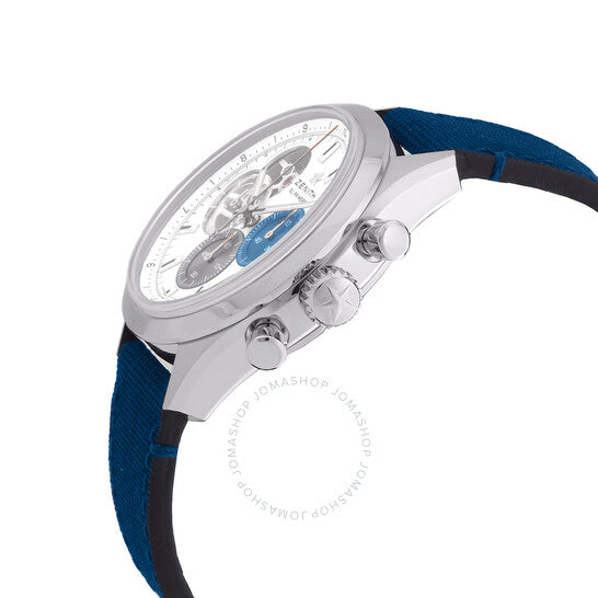 علبة فضية اللون من الفولاذ المقاوم للصدأ مع سوار مطاطي أزرق. إطار ثابت من الفولاذ المقاوم للصدأ فضي اللون. ميناء فضي اللون بعقارب وعلامات ساعات فضية اللون. مقياس سرعة الدوران حول الحافة الخارجية. نوع الميناء: تناظري. عقارب وعلامات مضيئة. كرونوغراف - ثلاثة أقراص فرعية تعرض: ٦٠ ثانية، ٦٠ دقيقة، وعُشر الثانية. حركة أوتوماتيكية من زينيث كاليبر إل بريميرو ٣٦٠٤ مع احتياطي طاقة لمدة ٦٠ ساعة. كريستال ياقوت مقاوم للخدش. تاج لولبي. غطاء خلفي شفاف. شكل دائري، مقاس العلبة: ٣٩.٥ مم. مشبك قابل للطي. مقاومة للماء حتى عمق ١٠٠ متر / ٣٣٠ قدمًا. الوظائف: كرونوغراف، ساعات، دقائق، ثوانٍ. سلسلة كرونو ماستر. طراز ساعة رسمية. علامة الساعة: صناعة سويسرية. ساعة زينيث كرونو ماستر كرونوغراف أوتوماتيكية للرجال ٠٣.٣٣٠٠.٣٦٠٤/٦٩.C٨٢٣.