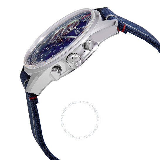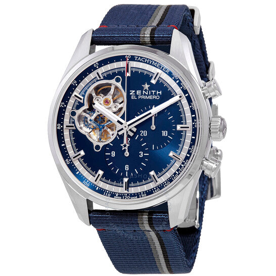 علبة من الفولاذ المقاوم للصدأ فضية اللون مع سوار نايلون أزرق. إطار ثابت من الفولاذ المقاوم للصدأ فضي اللون. ميناء أزرق (قلب مفتوح) مع عقارب وعلامات ساعات فضية مضيئة. علامات دقائق. علامات تاكيميتر حول الحافة الخارجية. نوع الميناء: تناظري. عقارب وعلامات مضيئة. كرونوغراف - ميناءان فرعيان يعرضان: ١٢ ساعة و٣٠ دقيقة. حركة أوتوماتيكية Zenith Calibre El Primero 4061، مبنية على Zenith El Primero 400، تحتوي على ٣١ جوهرة، تتكون من ٢٨٢ جزءًا، تنبض بمعدل ٣٦٠٠٠ ذبذبة في الساعة، ولديها احتياطي طاقة لمدة ٥٠ ساعة تقريبًا. كريستال ياقوت مقاوم للخدش. تاج سحب/دفع. غطاء خلفي شفاف. شكل دائري، حجم العلبة: ٤٢ مم، سمك العلبة: ١٤.٠٥ مم. عرض السوار: ٢١ مم. مشبك فراشة مع زر ضغط للفتح. مقاومة للماء حتى عمق ١٠٠ متر / ٣٣٠ قدمًا. الوظائف: كرونوغراف، عجلة عمودية، ساعات، دقائق، ثواني صغيرة، مقياس سرعة الدوران. سلسلة إل بريميرو. تصميم ساعة فاخر. علامة الساعة: صناعة سويسرية. ساعة زينيث كرونو ماستر كرونوغراف أوتوماتيكية 03.20416.4061/51.C802.