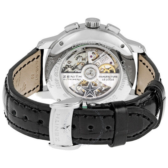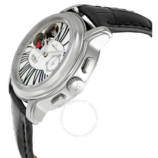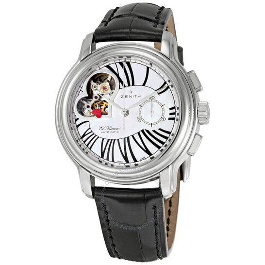 علبة مصقولة من الفولاذ المقاوم للصدأ مع سوار جلدي أسود. إطار ثابت من الفولاذ المقاوم للصدأ. ميناء أبيض من عرق اللؤلؤ مع شاشة سكلتون على شكل قلب أحمر، وعقارب فضية اللون وعلامات ساعات رومانية أنيقة. علامات دقائق حول الحافة الخارجية. عقارب وعلامات مضيئة. عرض الثواني الجارية مثبت في فتحة هيكلية. ميناء فرعي للساعة 30 دقيقة بالقرب من موضع الساعة 3. حركة أوتوماتيكية. كريستال ياقوت مقاوم للخدش. تاج لولبي. ظهر هيكلي. قطر العلبة: 37.5 مم. سمكها: 13.5 مم. مشبك قابل للطي. مقاومة للماء حتى عمق 30 مترًا. ساعة زينيث كرونو ماستر ستارت أوبن لوف النسائية 031230402180C672.