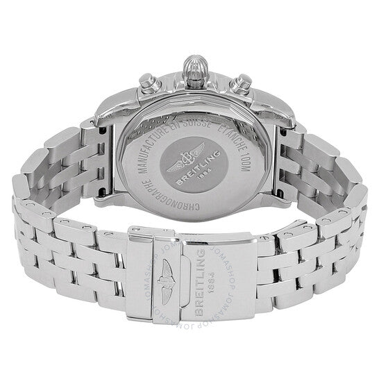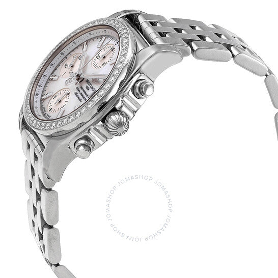 علبة وسوار من الفولاذ المقاوم للصدأ بلون فضي. إطار ثابت بلون فضي مرصع بالألماس. ميناء من عرق اللؤلؤ مع عقارب وعلامات ساعات فضية اللون. مقياس سرعة الدوران حول الحافة الداخلية. نوع الميناء: تناظري. عقارب وعلامات مضيئة. عرض التاريخ عند موضع الساعة 3. كرونوغراف - أقراص فرعية تعرض: ١٢ ساعة، ٣٠ دقيقة، ٦٠ ثانية. حركة بريتلينغ كاليبر ١٣ أوتوماتيكية، مبنية على ETA Valjoux ٧٧٥٠، تحتوي على ٢٥ جوهرة، تنبض بمعدل ٢٨٨٠٠ ذبذبة في الساعة، ولديها احتياطي طاقة لمدة ٤٢ ساعة تقريبًا. كريستال ياقوت مقاوم للخدش. غطاء خلفي صلب. شكل دائري، حجم العلبة: ٣٨ مم. مشبك قابل للطي. مقاومة للماء حتى عمق ١٠٠ متر / ٣٣٠ قدمًا. الوظائف: كرونوغراف، كرونومتر، تاريخ، ساعة، دقيقة، ثانية. سلسلة كرونومات ٣٨. تصميم ساعة فاخرة. علامة الساعة: سويسرية الصنع. ساعة بريتلينج كرونومات 38 أوتوماتيكية مرصعة بالألماس للسيدات A1331053/A774.