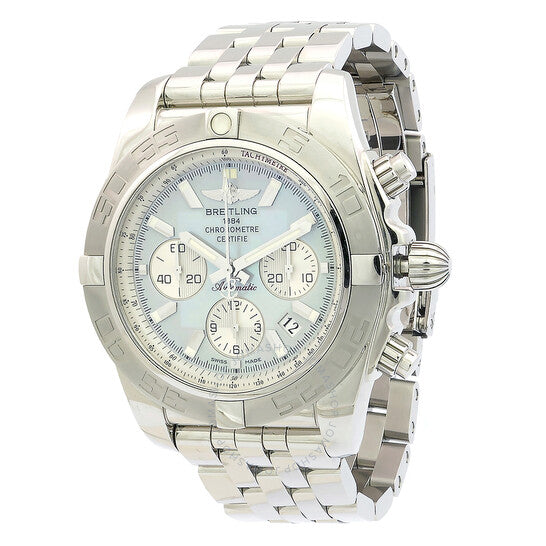 علبة وسوار من الفولاذ المقاوم للصدأ فضي اللون. إطار دوار أحادي الاتجاه من الفولاذ المقاوم للصدأ فضي اللون. ميناء من عرق اللؤلؤ مع عقارب وعلامات ساعات فضية اللون. مقياس سرعة الدوران. نوع الميناء: تناظري. عقارب وعلامات مضيئة. عرض التاريخ بين موضعي الساعة 4 و5. كرونوغراف - ثلاثة أقراص فرعية تعرض: 60 ثانية، 30 دقيقة، و12 ساعة. حركة بريتلينغ كاليبر 01 أوتوماتيكية، تحتوي على 47 جوهرة، مكونة من 346 جزءًا، تنبض بسرعة 28800 ذبذبة في الساعة، ولديها احتياطي طاقة لمدة 70 ساعة تقريبًا. كريستال ياقوت مقاوم للخدش. تاج لولبي. غطاء خلفي صلب. شكل العلبة دائري، مقاسها: 44 مم. مشبك قابل للطي. مقاومة للماء حتى عمق 500 متر / 1650 قدمًا. الوظائف: كرونوغراف، تاريخ، ساعة، دقيقة، ثانية. سلسلة كرونومات 44. طراز ساعة الغوص. ملصق الساعة: صناعة سويسرية. ساعة بريتلينج كرونومات 44 كرونوغراف أوتوماتيكية للرجال AB011011/G685.375A.