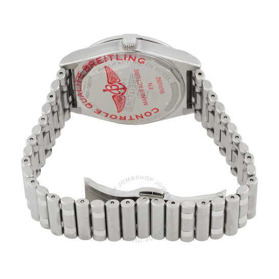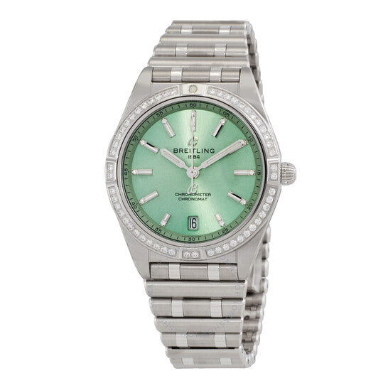 علبة فضية اللون من الفولاذ المقاوم للصدأ مع سوار مصقول ومصقول من الفولاذ المقاوم للصدأ. إطار فضي اللون مرصع بالألماس. ميناء أخضر بعقارب فضية اللون ومؤشرات ساعات مرصعة بالألماس. نوع الميناء: تناظري. عقارب مضيئة. عرض التاريخ عند موضع الساعة السادسة. حركة بريتلينغ كاليبر 10 أوتوماتيكية، مبنية على ETA 2892-A2، تحتوي على 21 جوهرة، تنبض بمعدل 28800 ذبذبة في الساعة، ولديها احتياطي طاقة لمدة 42 ساعة تقريبًا. زجاج ياقوت مقاوم للخدش. تاج قابل للسحب/الدفع. غطاء خلفي صلب. شكل دائري، حجم العلبة: 36 مم، سمكها: 10.1 مم. مشبك قابل للطي بزر ضغط. مقاومة للماء حتى عمق 100 متر / 330 قدمًا. الوظائف: التاريخ، الساعة، الدقيقة، الثانية. سلسلة كرونومات. طراز ساعة رسمية. علامة الساعة: صناعة سويسرية. ساعة بريتلينغ كرونومات أوتوماتيكية نسائية مرصعة بالألماس بمينا أخضر a10380591L1a1.