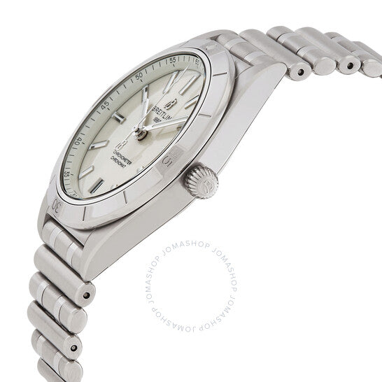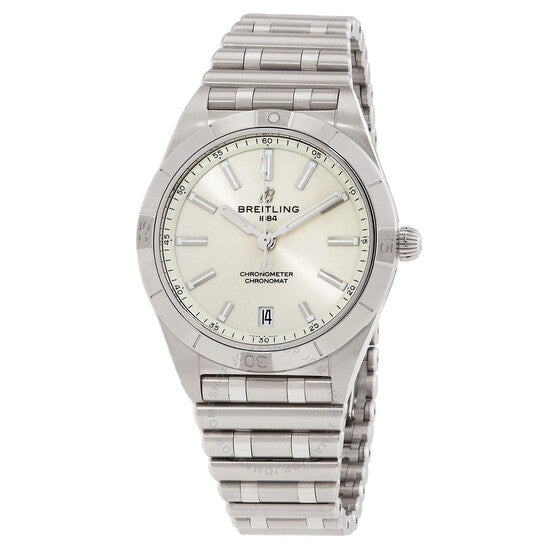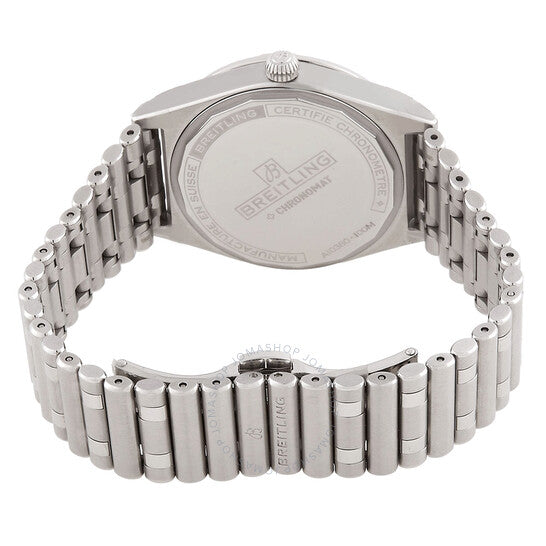 علبة فضية اللون من الفولاذ المقاوم للصدأ مع سوار مصقول ومصقول من الفولاذ المقاوم للصدأ. إطار دوار أحادي الاتجاه من الفولاذ المقاوم للصدأ فضي اللون. ميناء أبيض مع عقارب وعلامات ساعات فضية اللون. علامات دقائق حول الحافة الخارجية. نوع الميناء: تناظري. عقارب وعلامات مضيئة. عرض التاريخ عند موضع الساعة السادسة. حركة بريتلينغ كاليبر 10 أوتوماتيكية، مبنية على ETA 2892-A2، تحتوي على 21 جوهرة، تنبض بمعدل 28800 ذبذبة في الساعة، ولديها احتياطي طاقة لمدة 42 ساعة تقريبًا. زجاج ياقوت مقاوم للخدش. تاج قابل للسحب/الدفع. غطاء خلفي صلب. شكل العلبة دائري، مقاسها: 36 مم، سمكها: 10.1 مم. مشبك قابل للطي بزر ضغط. مقاومة للماء حتى عمق 100 متر / 330 قدمًا. الوظائف: التاريخ، الساعة، الدقائق، الثواني. سلسلة كرونومات. تصميم ساعة فاخرة. ساعة بريتلينج كرونومات أوتوماتيكية بمينا أبيض للسيدات a10380101a3a1.