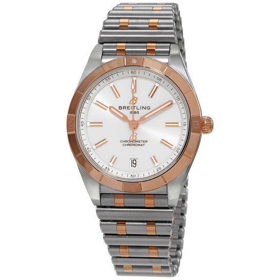 علبة من الفولاذ المقاوم للصدأ مع سوار من الفولاذ المقاوم للصدأ بوصلات من الذهب الوردي عيار 18 قيراطًا. إطار دوار أحادي الاتجاه من الذهب الوردي عيار 18 قيراطًا. ميناء أبيض مع عقارب مضيئة من الذهب الوردي وعلامات ساعات مؤشرة. علامات دقائق عربية (بفاصل 5 دقائق). علامات دقائق حول الحافة الخارجية. نوع الميناء: تناظري. عقارب وعلامات مضيئة. عرض التاريخ عند موضع الساعة 6. حركة بريتلينغ أوتوماتيكية كاليبر 10، مبنية على ETA 2892-A2، تحتوي على 21 جوهرة، تنبض بمعدل 28800 ذبذبة في الساعة، ولديها احتياطي طاقة لمدة 42 ساعة تقريبًا. كريستال ياقوت مقاوم للخدش. تاج سحب/دفع. غطاء خلفي صلب. شكل دائري. حجم العلبة: 36 مم. سمك العلبة: 10.1 مم. عرض السوار: 18 مم. مشبك قابل للطي بزر ضغط للتحرير. مقاومة للماء حتى عمق 100 متر / 330 قدمًا. الوظائف: التاريخ، الساعة، الدقائق، الثواني. سلسلة كرونومات. ساعة فاخرة. علامة الساعة: صناعة سويسرية. ساعة بريتلينغ كرونومات أوتوماتيكية نسائية بمينا أبيض U10380101A1U1.