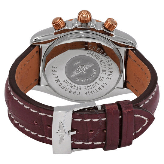 علبة فضية اللون من الفولاذ المقاوم للصدأ مع سوار من جلد التمساح بلون عنابي. إطار دوار أحادي الاتجاه من الذهب الوردي عيار 18 قيراطًا. ميناء عنابي اللون مع عقارب من الذهب الوردي وعلامات ساعات بأرقام رومانية. مقياس سرعة الدوران. نوع الميناء: تناظري. عقارب وعلامات مضيئة. عرض التاريخ عند موضع الساعة 3. كرونوغراف - ثلاثة أقراص فرعية تعرض: 60 ثانية، 30 دقيقة، و12 ساعة. حركة أوتوماتيكية. كريستال ياقوت مقاوم للخدش. تاج لولبي. غطاء خلفي صلب. شكل دائري، حجم العلبة: 43.7 مم. مقاومة للماء حتى عمق 300 متر / 1000 قدم. الوظائف: كرونوغراف، تاريخ، ساعة، دقيقة، ثانية. كرونومات كاليبر 13 سلسلة. تصميم ساعة فاخرة. علامة الساعة: صناعة سويسرية. ساعة بريتلينج كرونومات كاليبر 13 كرونوغراف أوتوماتيكية للرجال C1335612/K515.735P.A20BA.1.