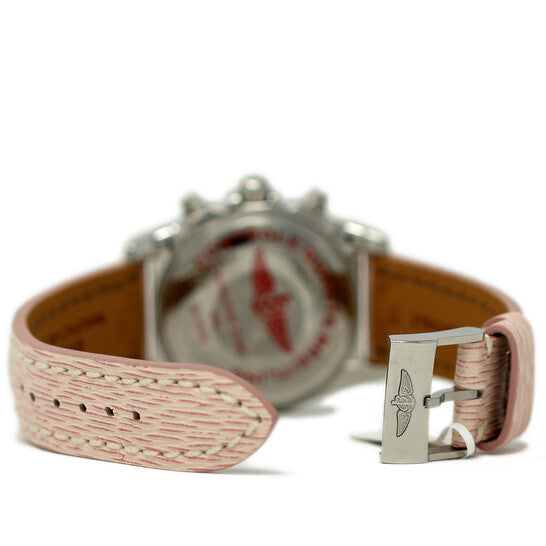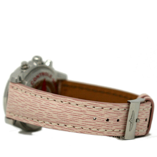 علبة من الفولاذ المقاوم للصدأ فضية اللون مع سوار جلدي وردي. إطار ثابت فضي اللون مرصع بالألماس. ميناء من عرق اللؤلؤ مع عقارب فضية اللون وعلامات ساعات من الألماس. علامات دقائق حول الحافة الخارجية. نوع الميناء: تناظري. عقارب مضيئة. عرض التاريخ عند موضع الساعة 3. كرونوغراف - ثلاثة أقراص فرعية تعرض: 60 ثانية، 30 دقيقة، و12 ساعة. حركة بريتلينغ كاليبر 13 أوتوماتيكية، مبنية على ETA Valjoux 7750، تحتوي على 25 جوهرة، تنبض بمعدل 28800 ذبذبة في الساعة، ولديها احتياطي طاقة لمدة 42 ساعة تقريبًا. زجاج ياقوت مقاوم للخدش. تاج لولبي. غطاء خلفي صلب. شكل دائري، حجم العلبة: 38 مم، سمكها: 14.8 مم. مشبك بإبزيم. مقاومة للماء حتى عمق 100 متر / 330 قدمًا. الوظائف: كرونوغراف، تاريخ، ساعة، دقيقة، ثانية، كرونومتر. طراز ساعة رياضية. علامة الساعة: صناعة سويسرية. ساعة بريتلينغ كرونومات كرونوغراف أوتوماتيكية كرونومتر مرصعة بالألماس للرجال A1331053-A776.