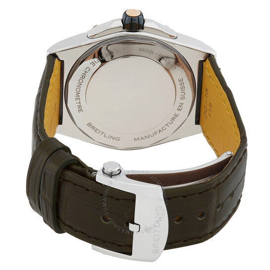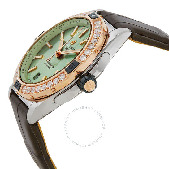 علبة من الفولاذ المقاوم للصدأ بلونين (فضي وذهبي وردي) مع سوار من جلد التمساح بلون أخضر زيتوني. إطار دوار أحادي الاتجاه بلون ذهبي وردي مرصع بالألماس. ميناء بلون أخضر نعناعي مع عقارب وعلامات ساعات ذهبية وردية. علامات دقائق حول الحافة الخارجية. نوع الميناء: تناظري. عقارب وعلامات مضيئة. عرض التاريخ عند موضع الساعة السادسة. حركة بريتلينغ كاليبر 10 أوتوماتيكية، مبنية على ETA 2892-A2، تحتوي على 21 جوهرة، تنبض بمعدل 28800 ذبذبة في الساعة، ولديها احتياطي طاقة لمدة 42 ساعة تقريبًا. زجاج ياقوت مقاوم للخدش. غطاء خلفي صلب. شكل العلبة دائري، مقاسها: 38 مم، سمكها: 11.8 مم. مشبك بإبزيم. مقاومة للماء حتى عمق 100 متر / 330 قدمًا. الوظائف: التاريخ، الساعة، الدقيقة، الثانية. سلسلة كرونومات. طراز ساعة رسمية. ملصق الساعة: صناعة سويسرية. ساعة بريتلينج كرونومات سوبر أوتوماتيك 38 مم مرصعة بالألماس للسيدات U17356531L1P1.
