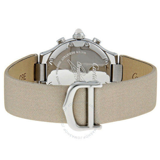 علبة من الفولاذ المقاوم للصدأ مع سوار رمادي ساتان (مغطى بالجلد). إطار ثابت من الفولاذ المقاوم للصدأ. ميناء وردي فضي بنقشة أشعة الشمس مع عقارب مضيئة وعلامات ساعات رومانية. علامات دقائق حول الحافة الخارجية. نوع الميناء: تناظري. عقارب مضيئة. عرض التاريخ عند موضع الساعة الرابعة. كرونوغراف - ثلاثة أقراص فرعية تعرض: ٦٠ ثانية، ٣٠ دقيقة، وعُشر الثانية. حركة كوارتز كارتييه عيار ٤٧١. كريستال ياقوت مقاوم للخدش. فولاذ مرصع بتاج من المطاط الأبيض الكابوشون. غطاء خلفي صلب. شكل دائري. حجم العلبة: ٣٥.٩ مم. سمكها: ٩.١٥ مم. عرض السوار: ٢٠ مم. مشبك قابل للطي. مقاومة للماء حتى عمق ١٠٠ متر / ٣٣٠ قدمًا. الوظائف: الساعات، الدقائق، الثواني، التقويم، الكرونوغراف. معلومات إضافية: مناسبة للغطس، والسباحة، ولكنها غير مناسبة للغوص. طراز ساعة رياضية. علامة الساعة: صناعة سويسرية. ساعة كارتييه كرونوسكاف كرونوغراف بمينا فضية للسيدات W1020012.